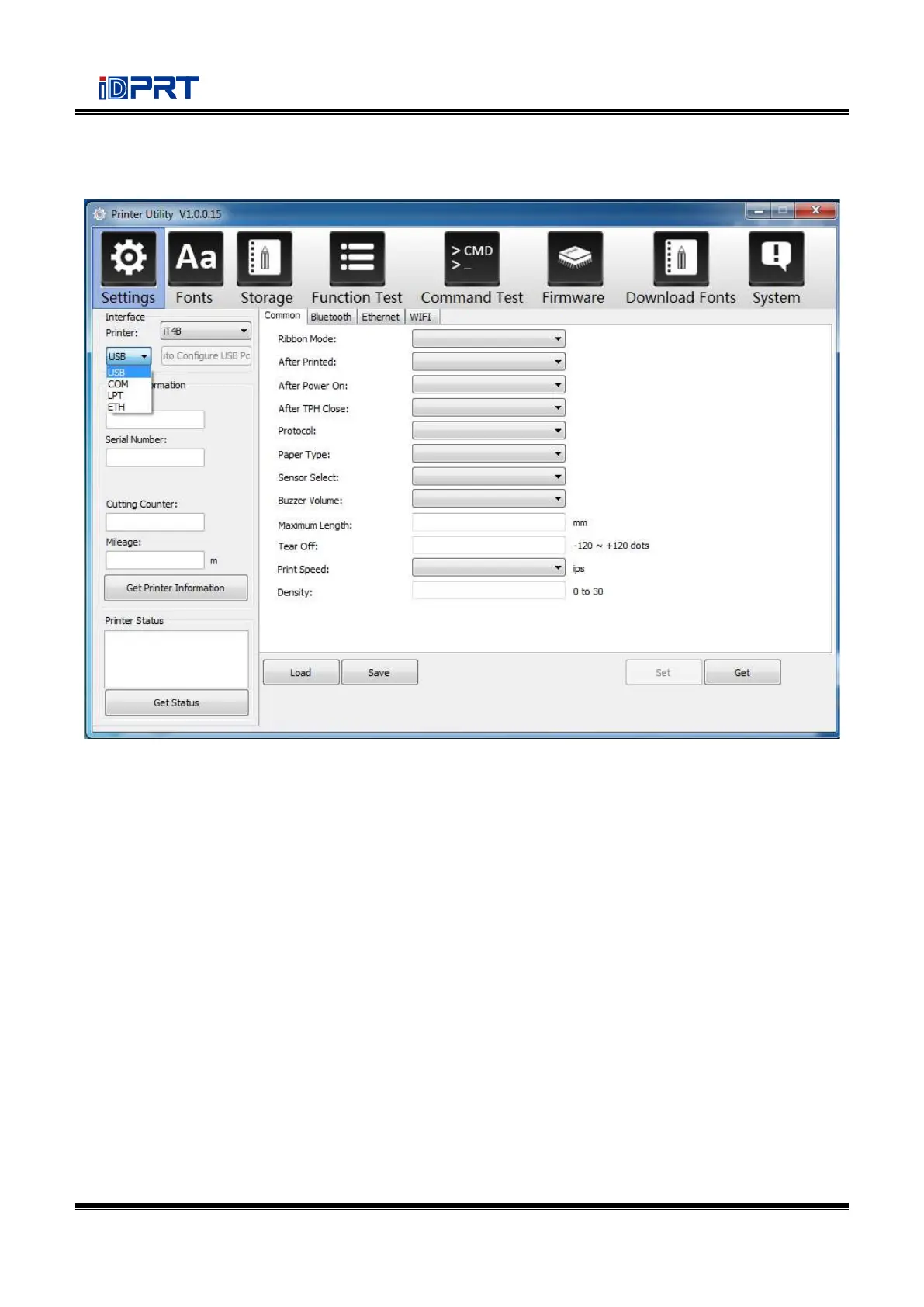 (1) Set up the interface needed. (range: USB, COM, LPT, ETH)
