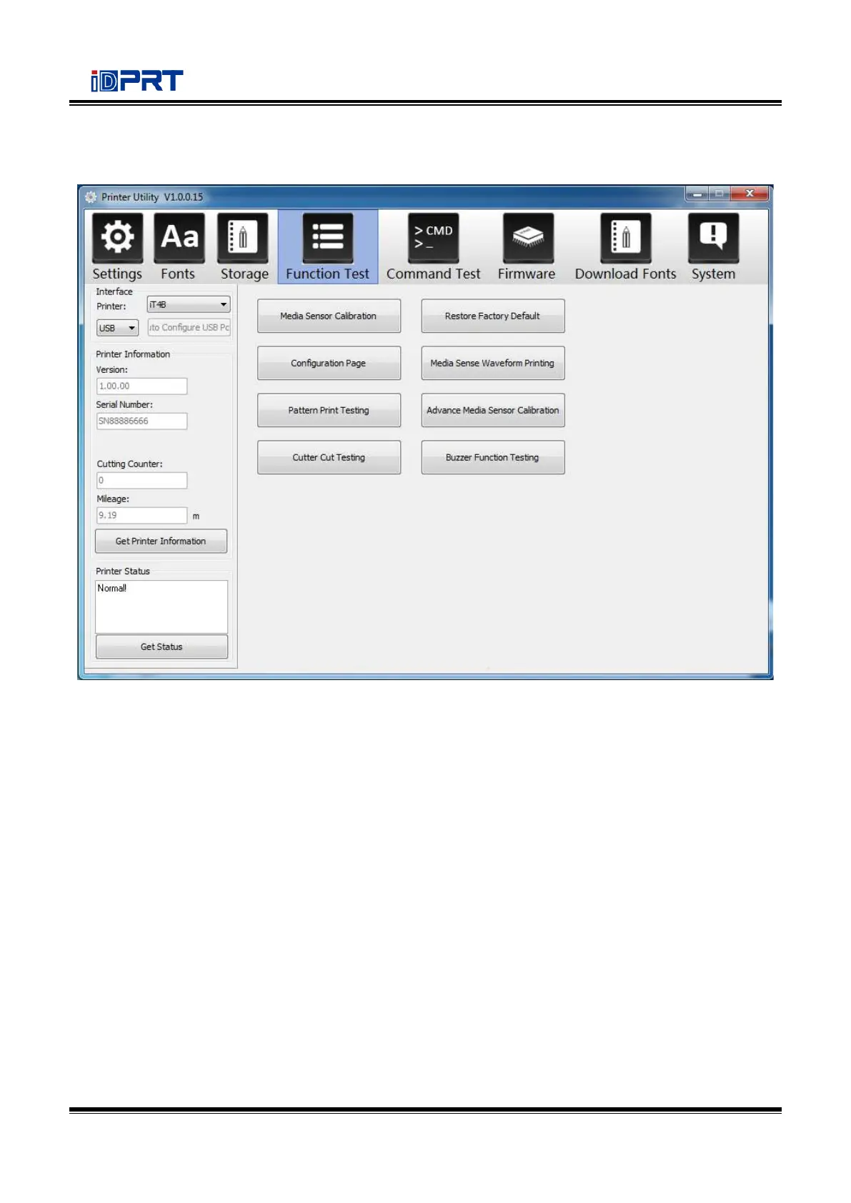 5.Click “Function Test. User can carry the followings such as sensor calibration, pattern print testing