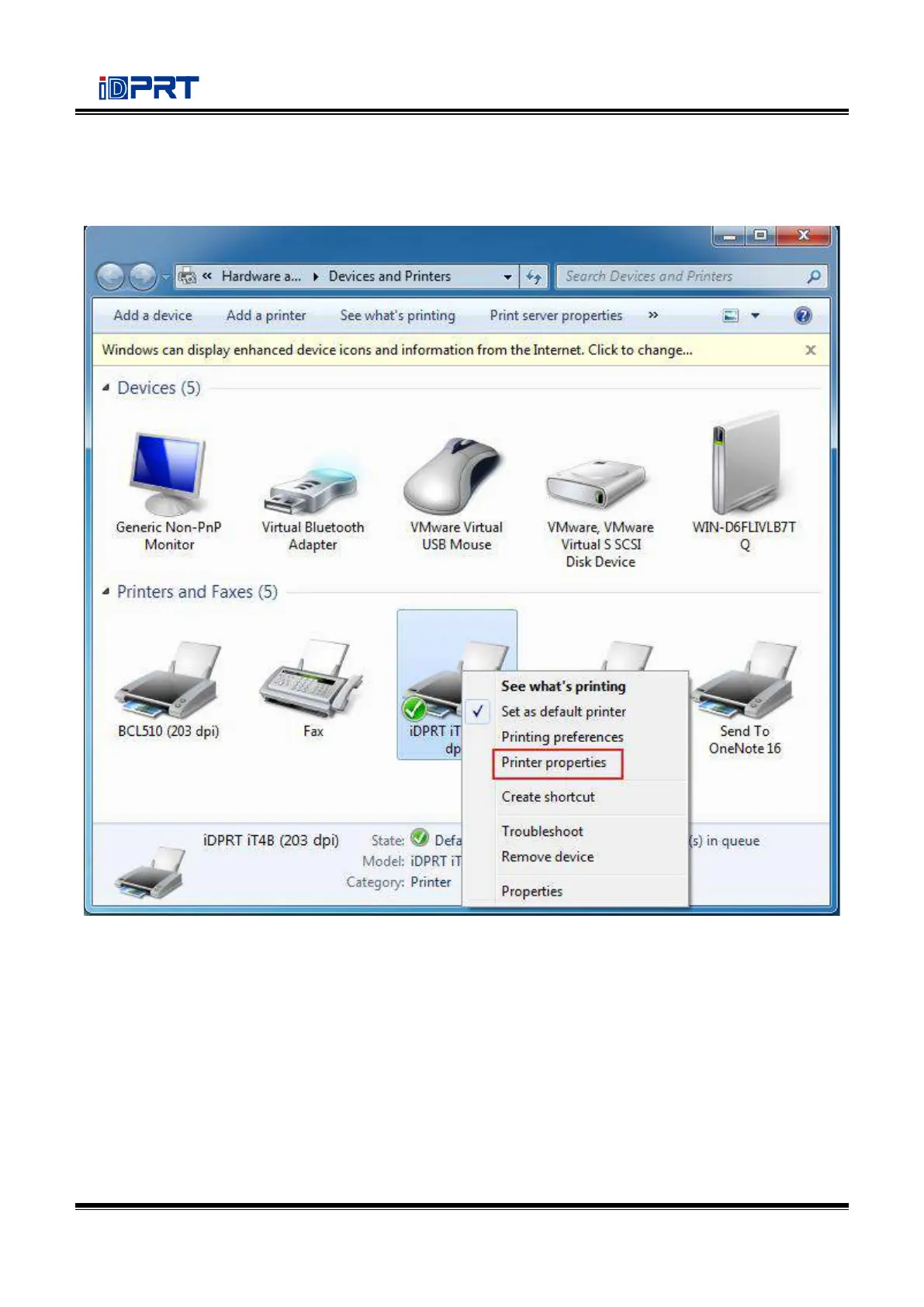 1.Click “Start“Devices and Printers”. Right click the icon and choose “Printer properties”.