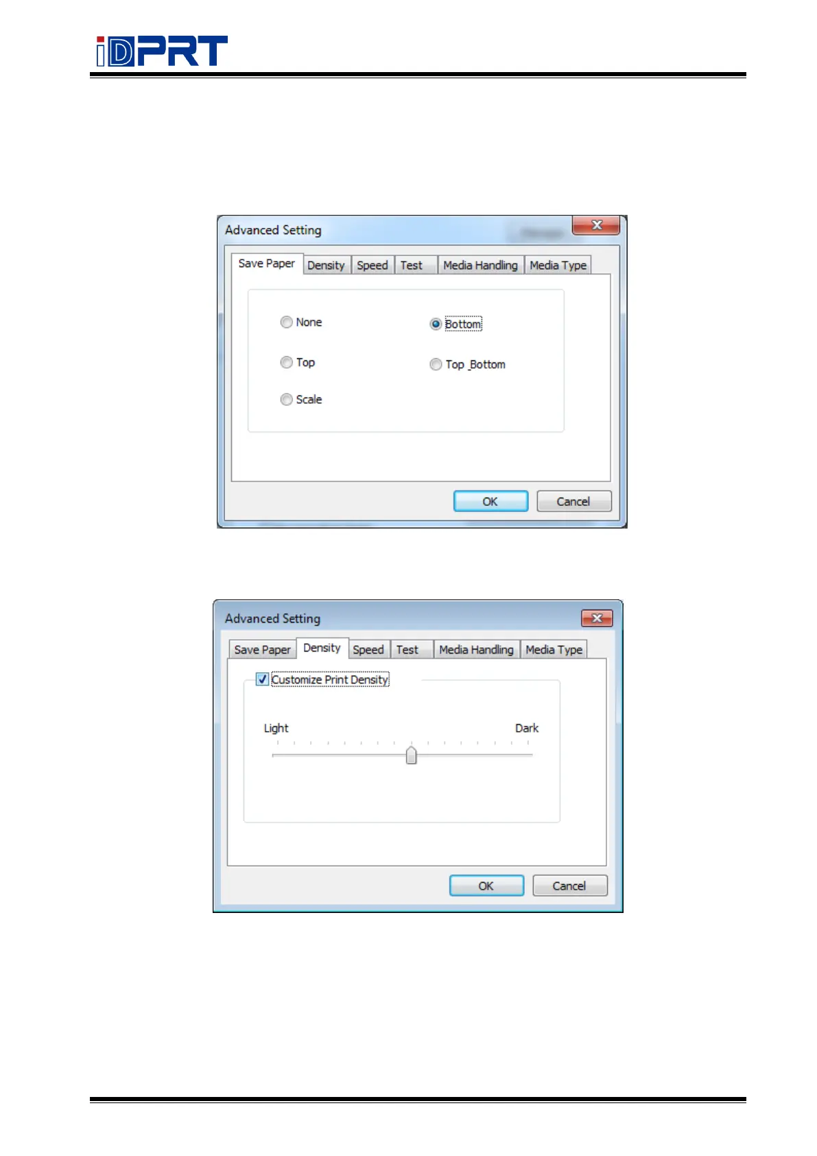 ●Click Advanced” to set “Save Paper, “Density, “Speed”, Test, “Media Handling and