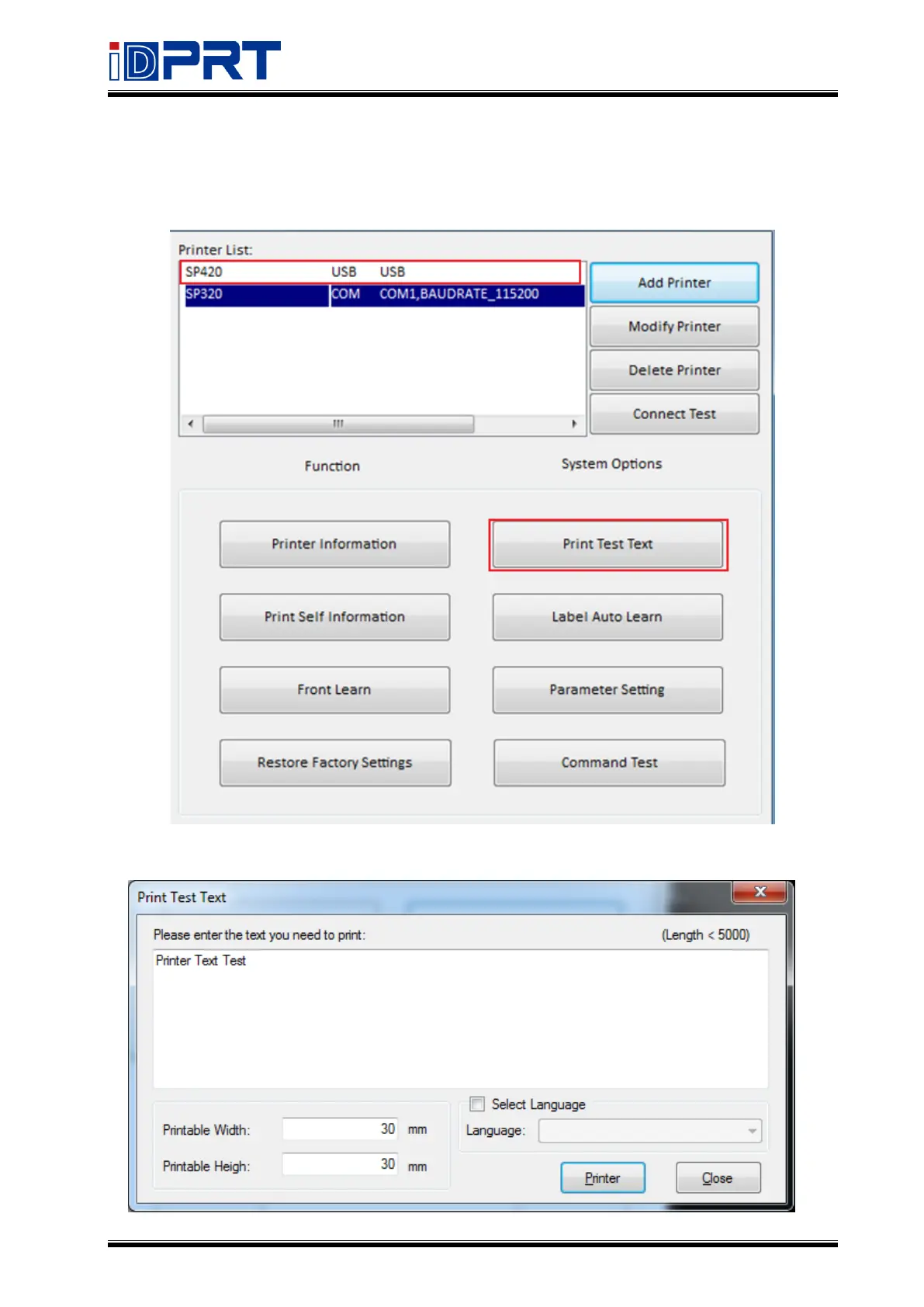 Click “Print Test Text”, edit the text→ Set up the printing range (printable width & height) →Click