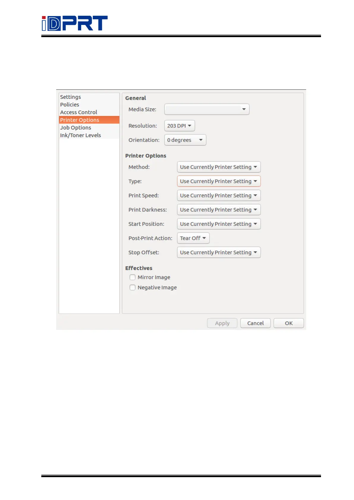 Select General, Printer Options, Effectives for detailed setting, then the printer will