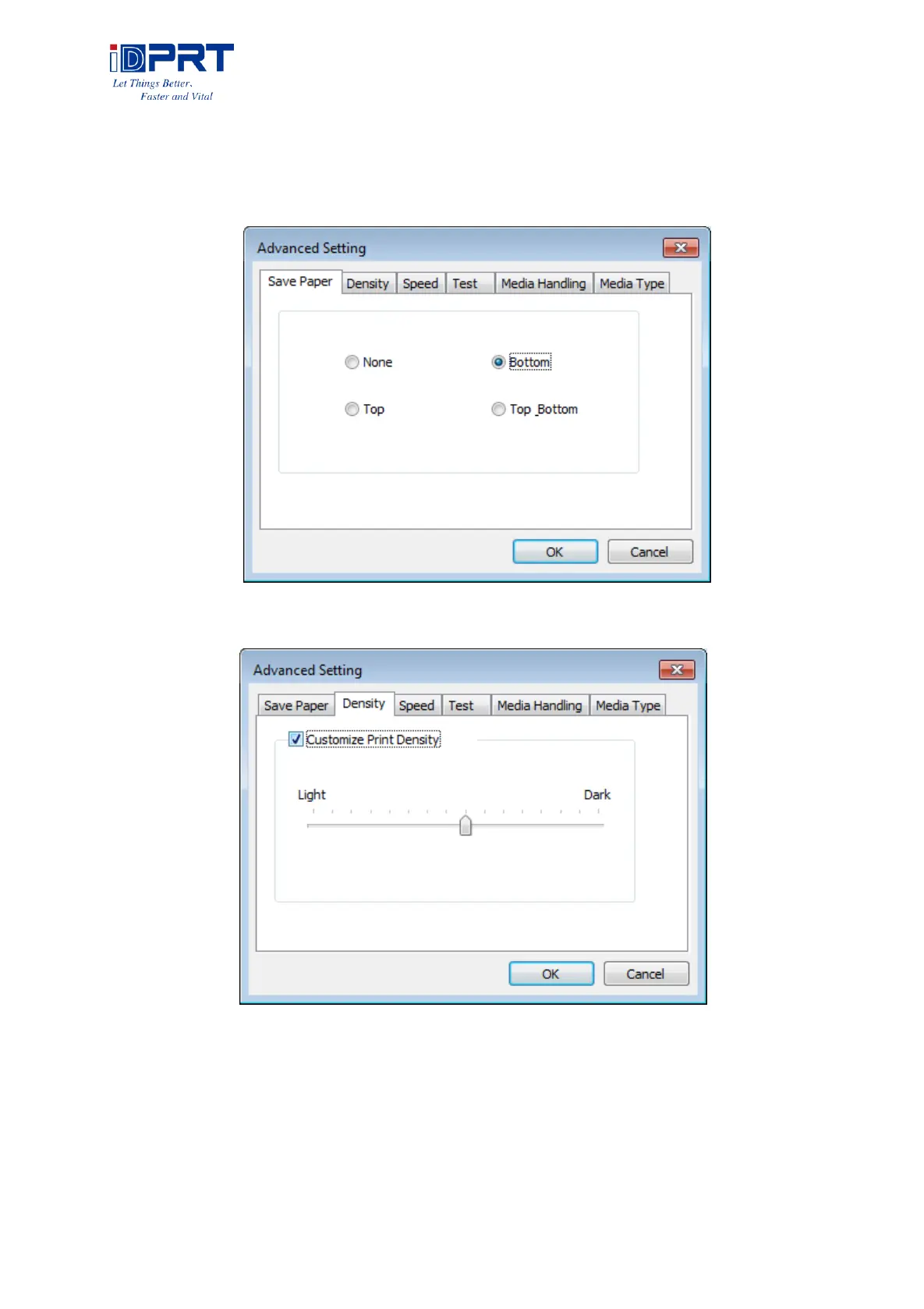 Click Advanced to set “Save Paper, “Density, “Speed”, Test, “Media Handling, “Media