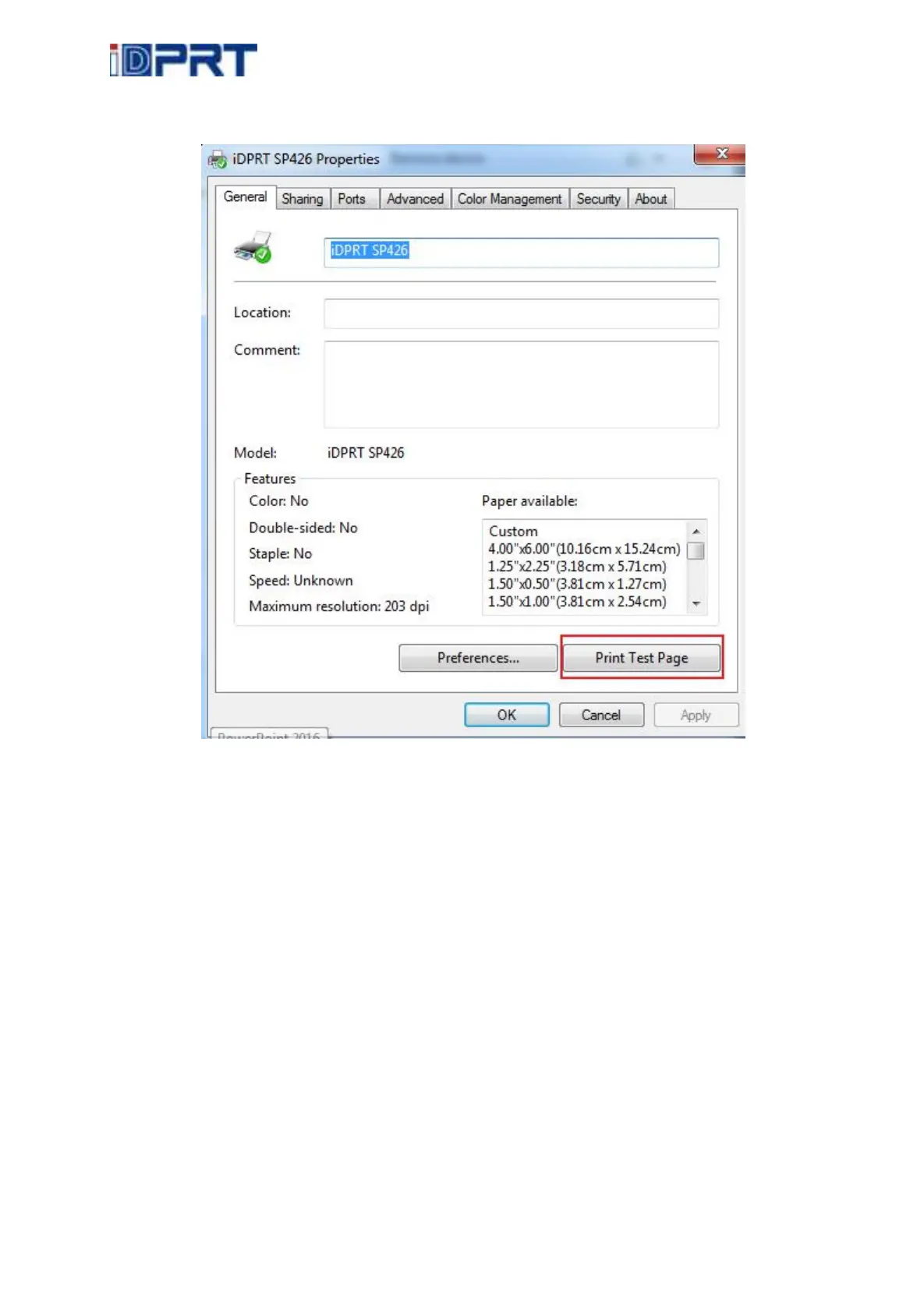 2.Click “General” “Print Test Page”, and the printer will print the current settings.