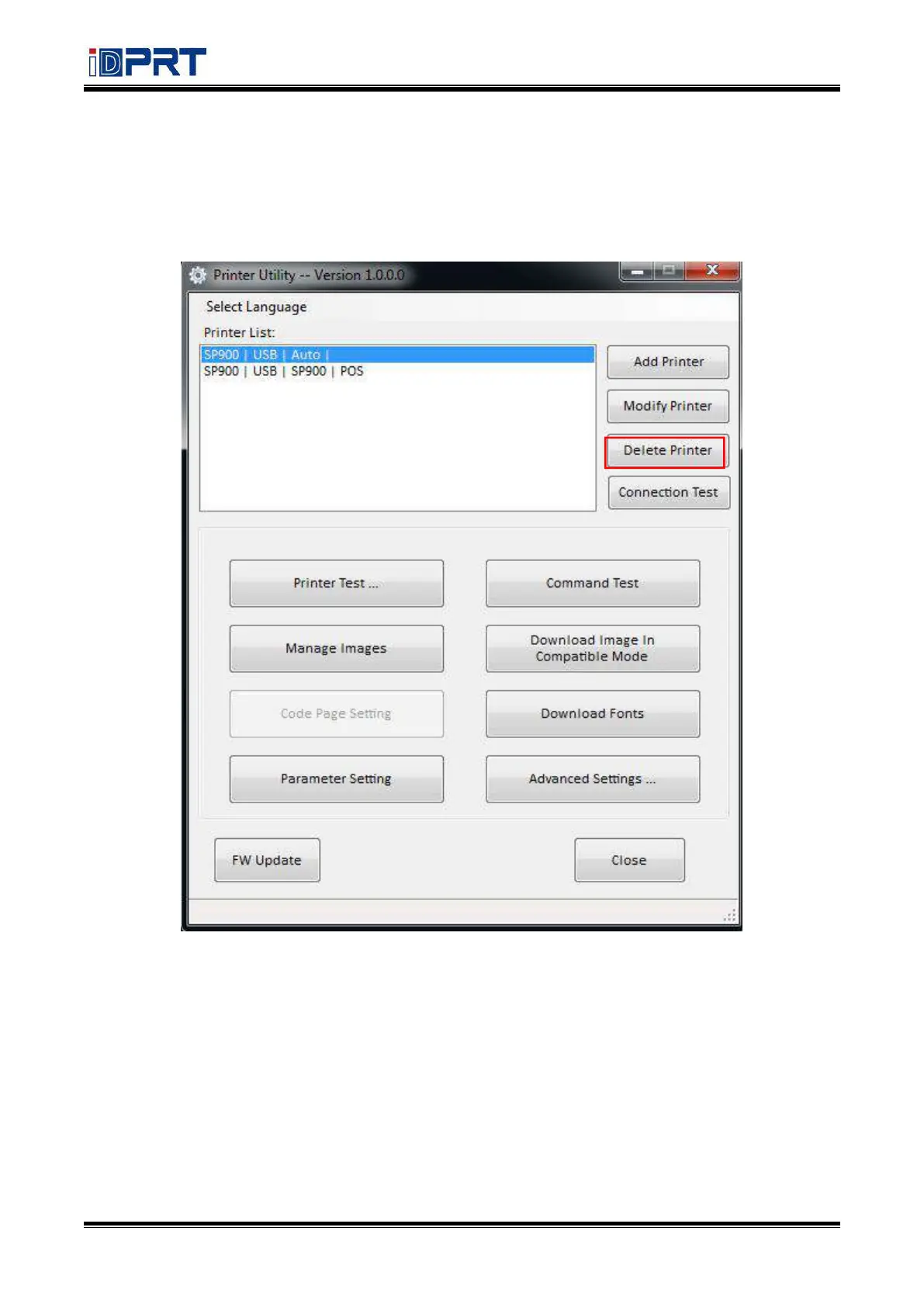 1) Choose the printer you want to delete in the list and click “Delete Printer.