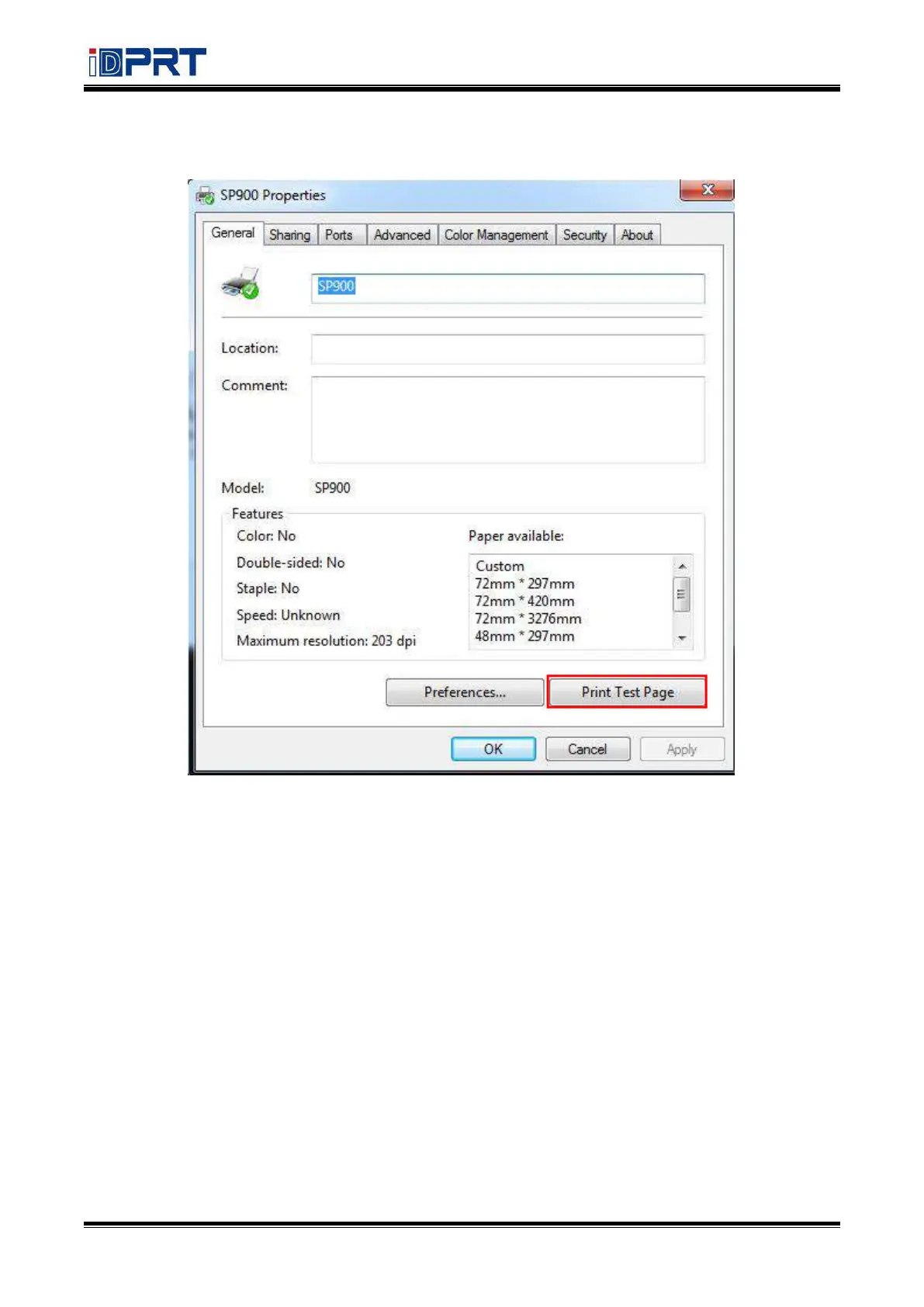 Click “Print Test Page” to view the printing effect.