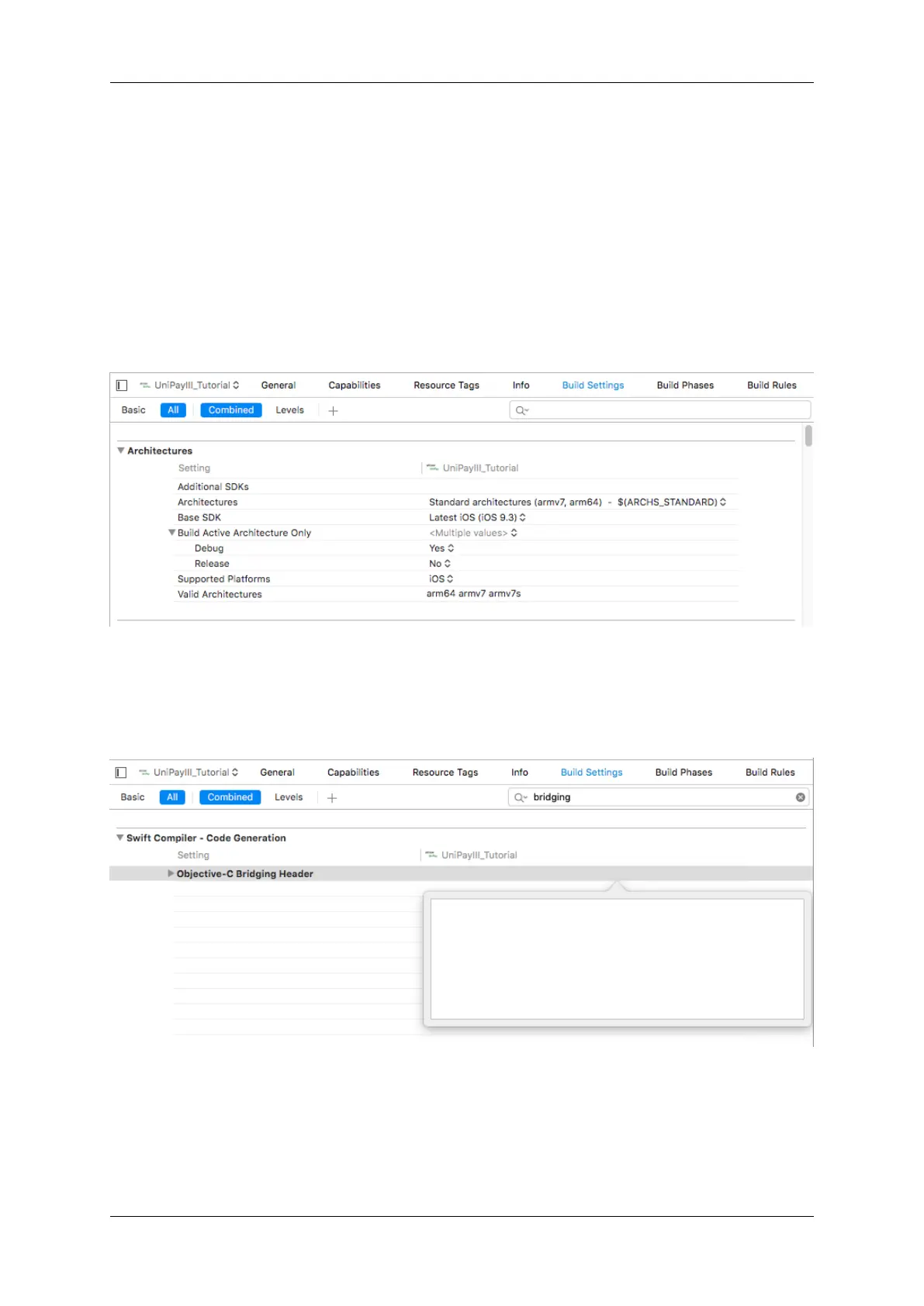Next, you will need to link your header file to the bridging header setting. Navigate to Build Settings within Xcode