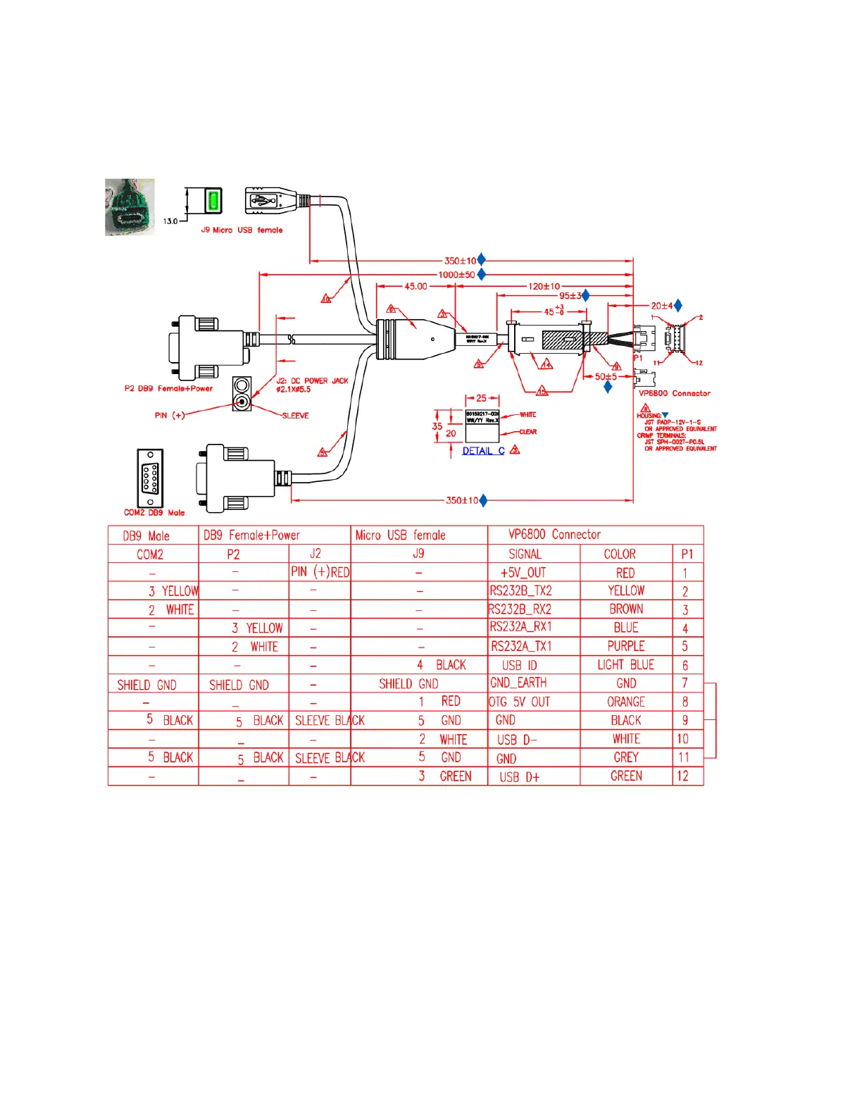 The VP6800 uses a serial port to USB +RS-232+RS-232 cable. The cable connectors follow the