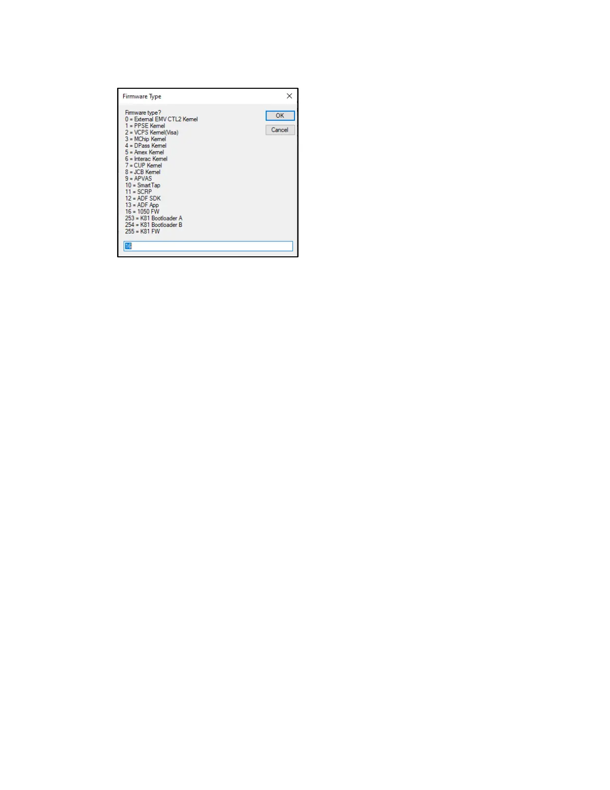 10. This time in the Firmware Type dialog, enter 16 for RT1050 FW and click OK.
