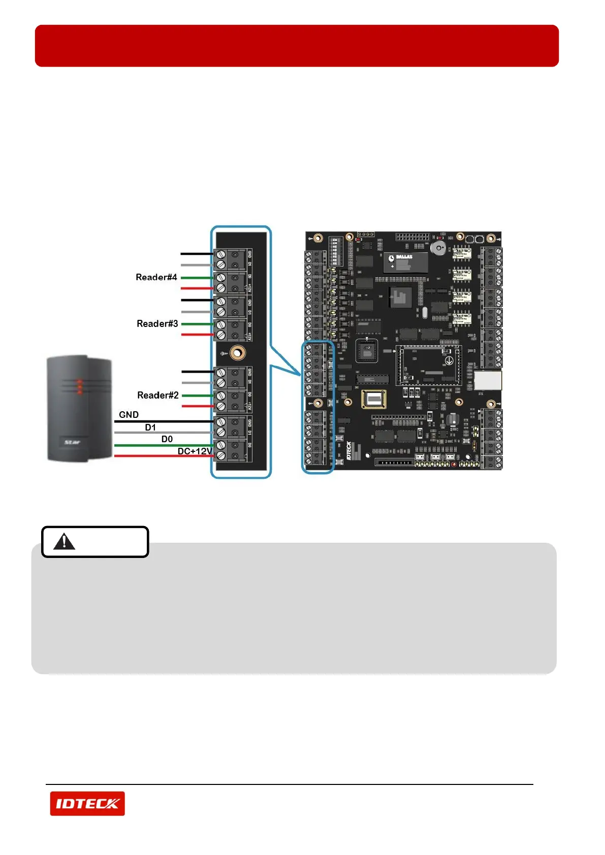 - Connect +12V (red) wire of RF reader to Reader Port terminal block (+12V) of iTDC/iTDC-SR.