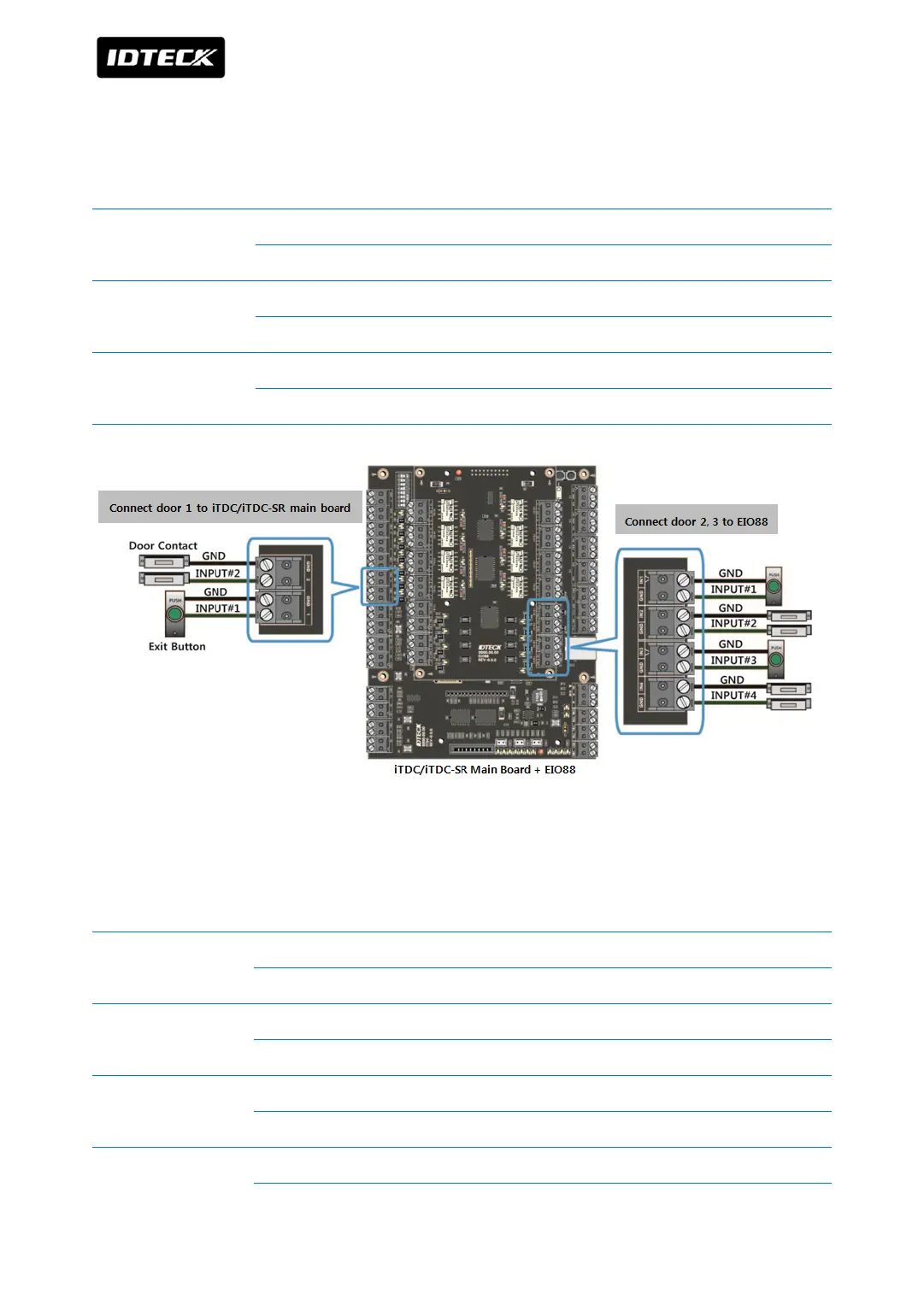 Firstly equip I/O board(EIO88) to iTDC/iTDC-SR then wire. Door 1 and 2 are controlled by