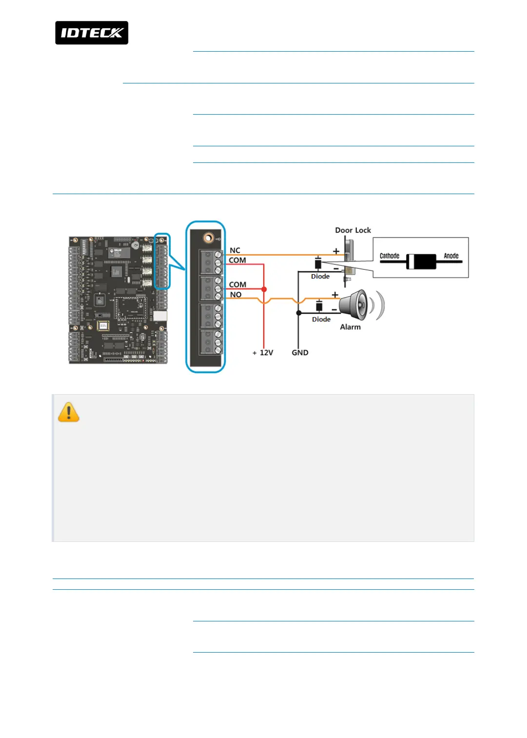 Anti-inverse voltage diode has to be connected near door lock or alarm.