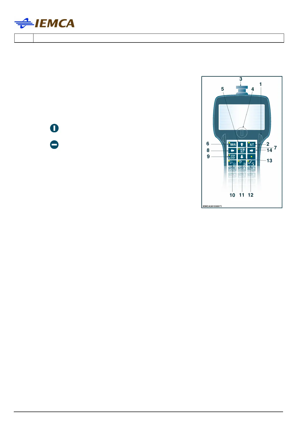 12 Lift and lower the pneumatic bar drop controls device (led on when this device is low).