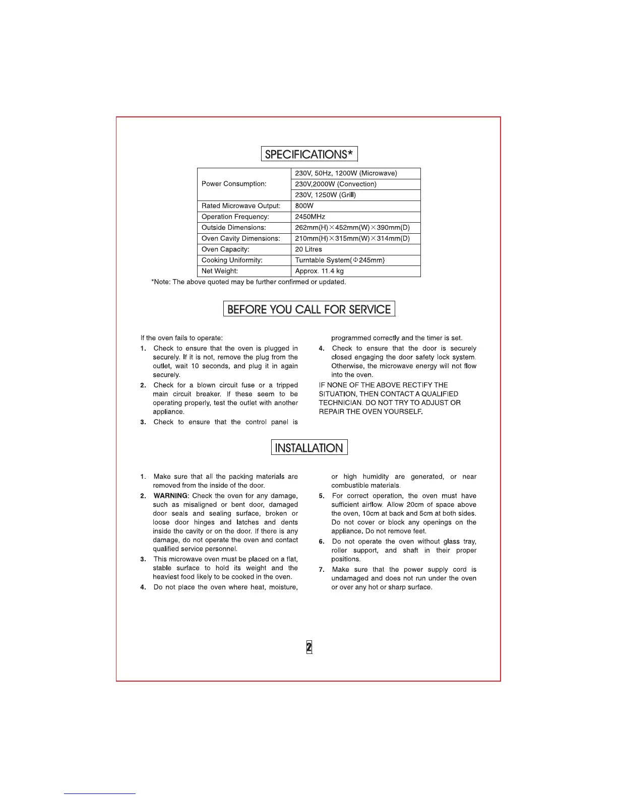 IFB 20SC2 - Specifications; Before You Call for Service; Installation