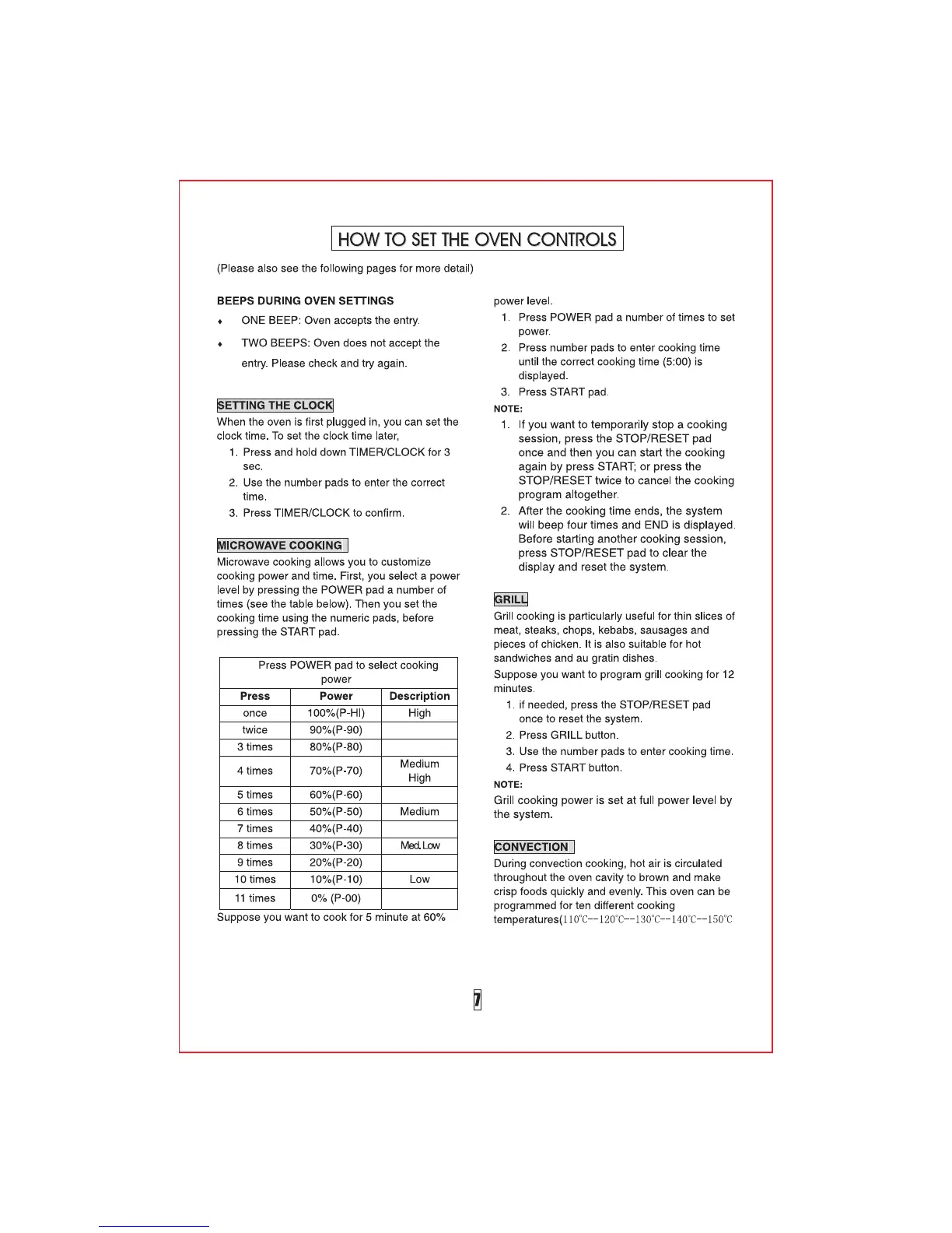 IFB 20SC2 - How to Set the Oven Controls; Oven Feedback and Clock Setting; Microwave Cooking Setup; Grill and Convection Cooking