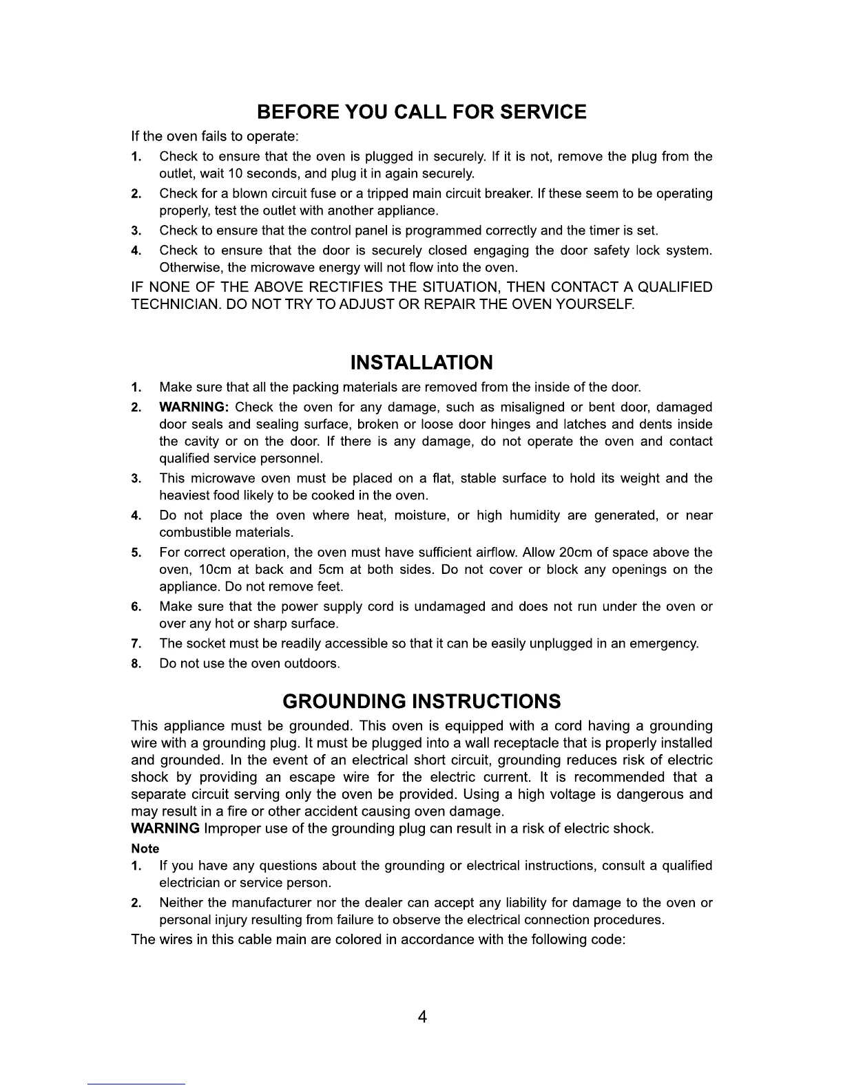 IFB 25DGSC1 - Before You Call for Service; Installation; Grounding Instructions