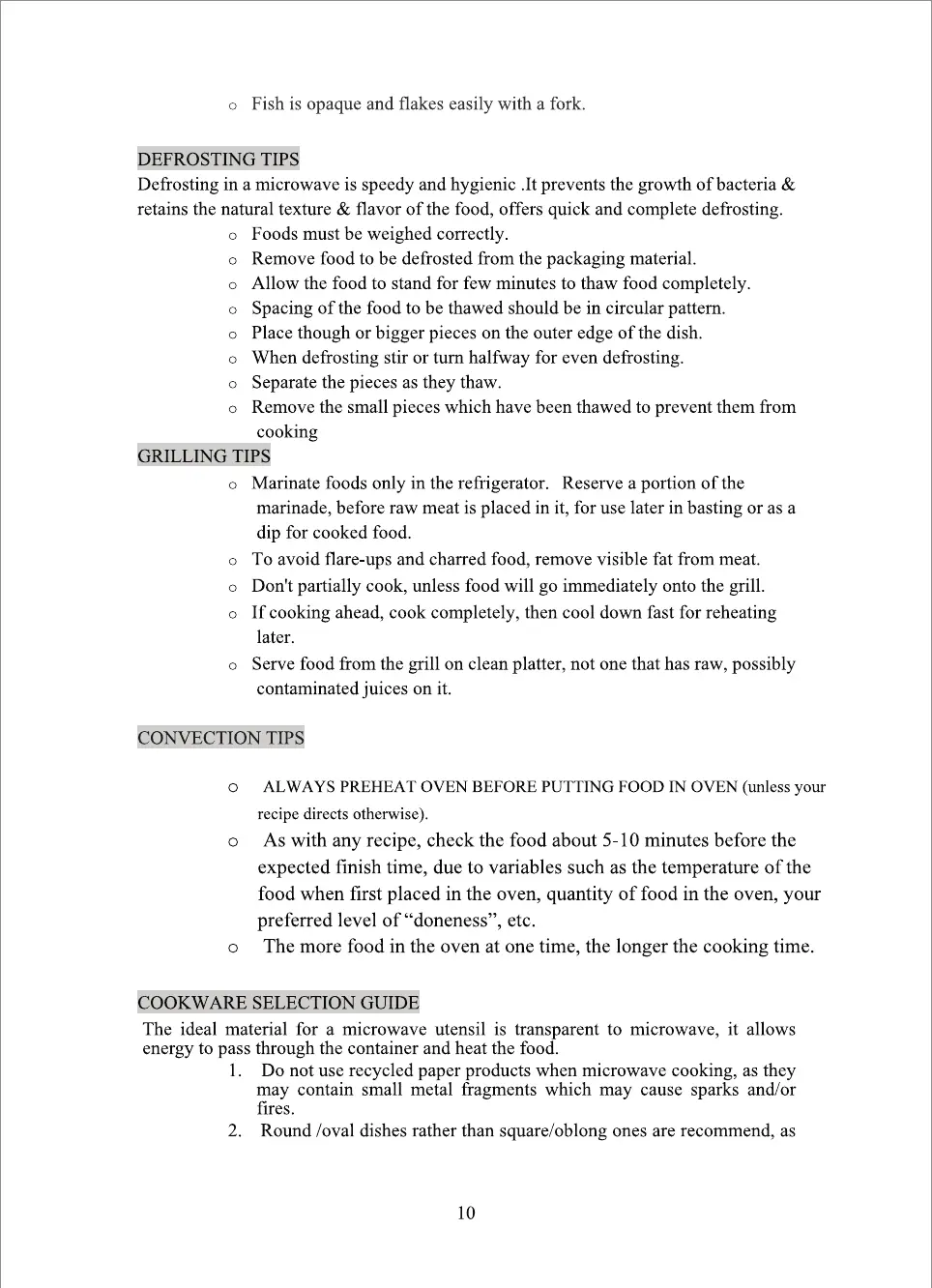 IFB 25SC4 - Defrosting Tips; Grilling Tips; Convection Tips; Cookware Selection Guide