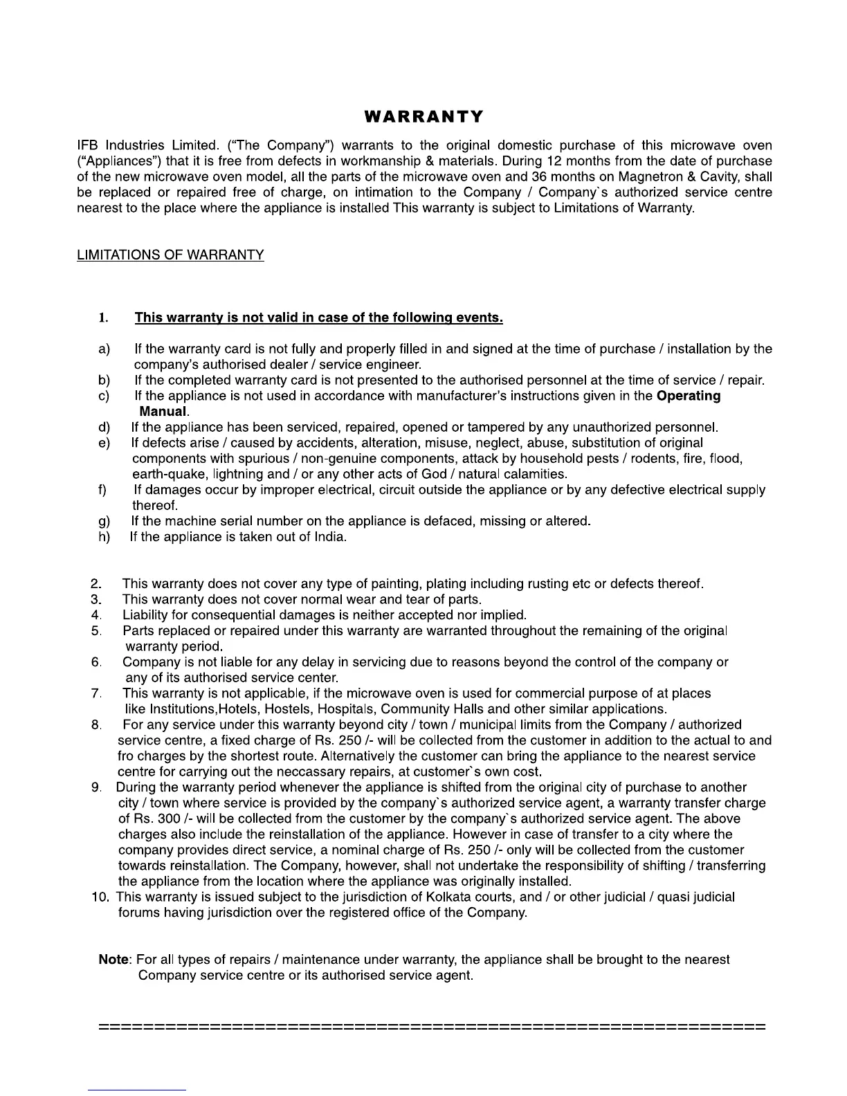 IFB 38SRC1 - Warranty Information