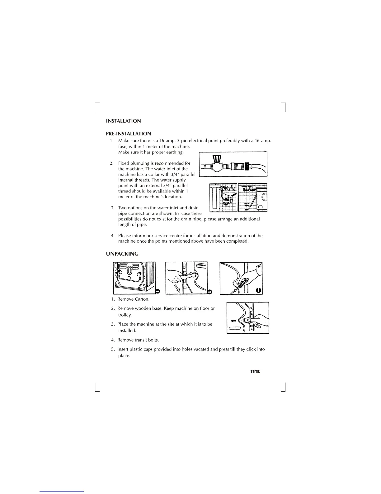 IFB Executive Elite - INSTALLATION AND SETUP; Pre-Installation and Unpacking