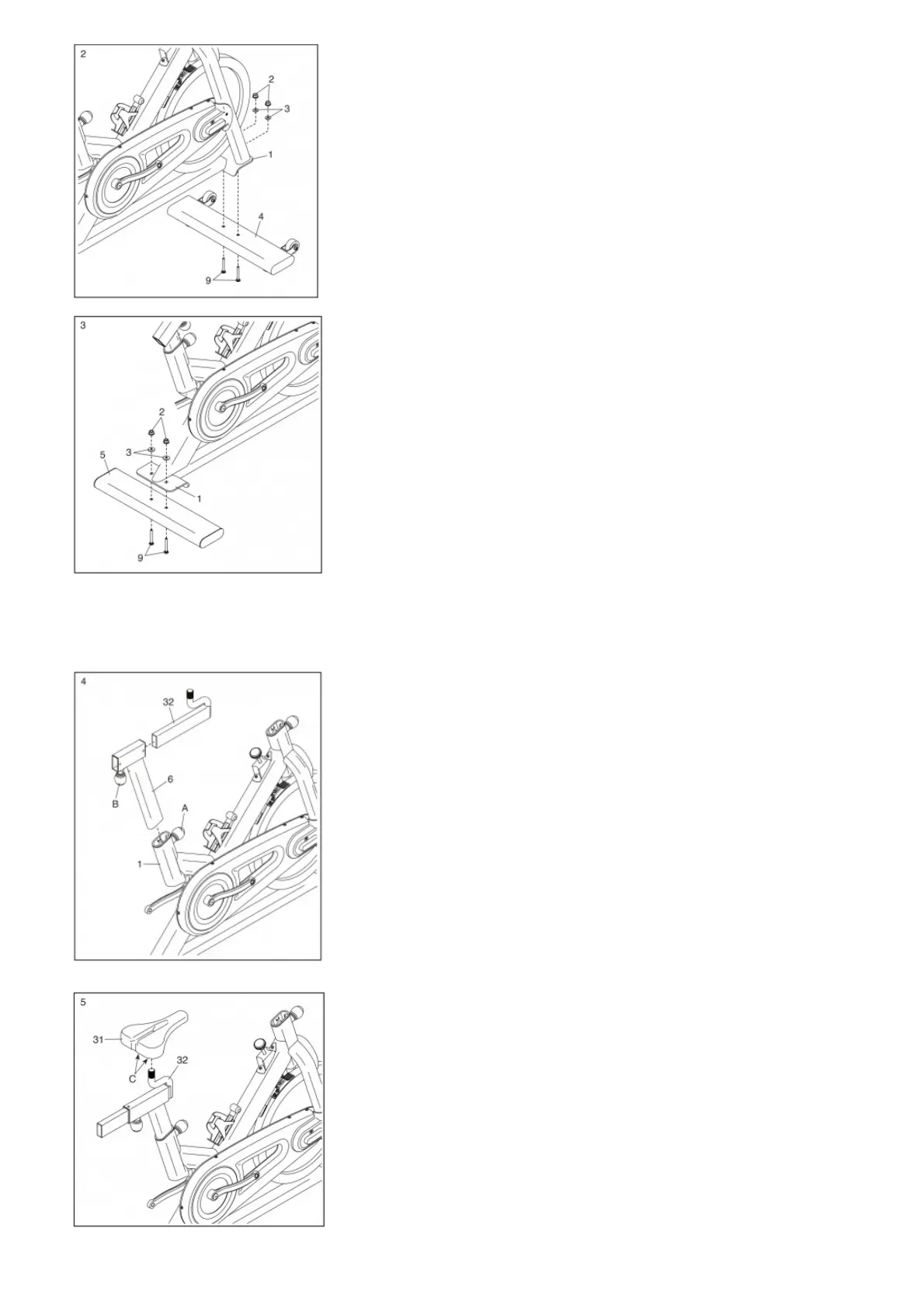 Slide the Saddle (31) onto the Saddle Carriage (32); make sure that the Saddle is level and is pointing straight ahead. Then, tighten the two nuts (C) beneath the Saddle.