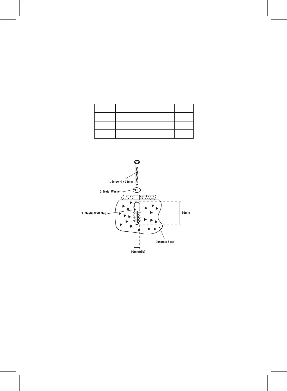 6) Put the Screw (3) through the Metal Washer (2) and screw through tile Pedestal holes into the Wall Plug (1).