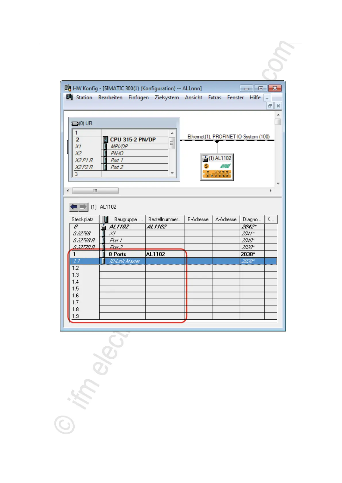 Move the [8 Ports] node via drag&drop from the hardware catalogue to slot 1 of the AL1102.
