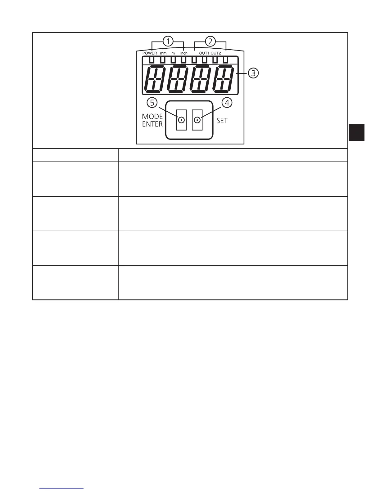 1: 4 x LED green Lighting LED = power and set display unit (mm, m, inch)