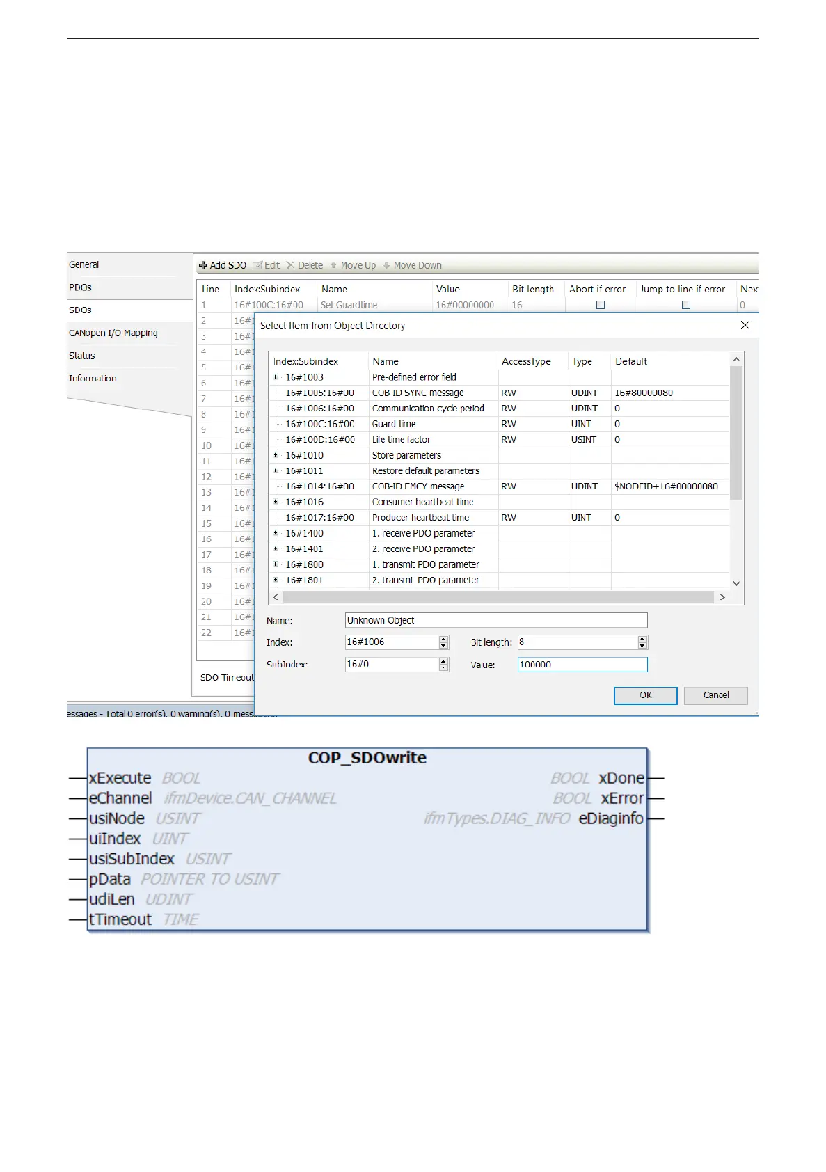 supplementing the SDO list in the CANopen configurator or during the operating
