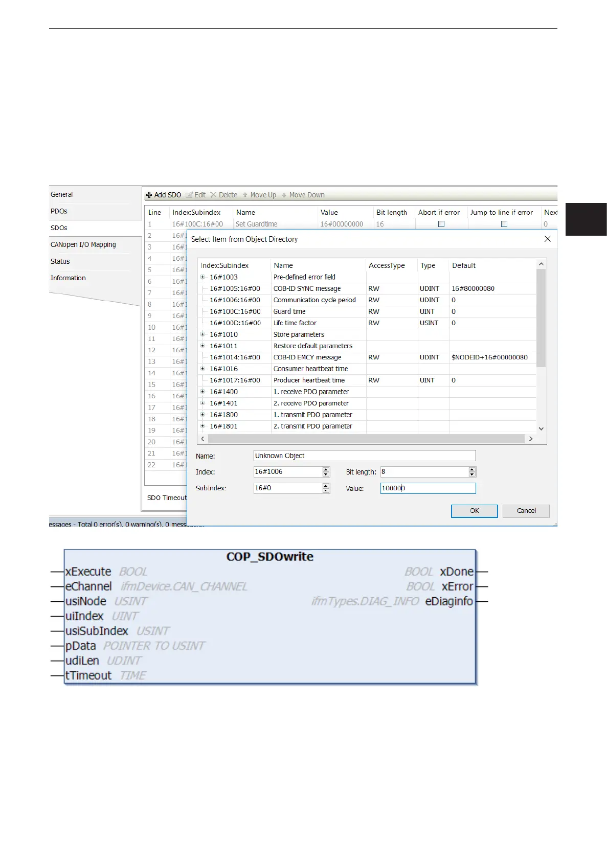supplementing the SDO list in the CANopen configurator or during the operating