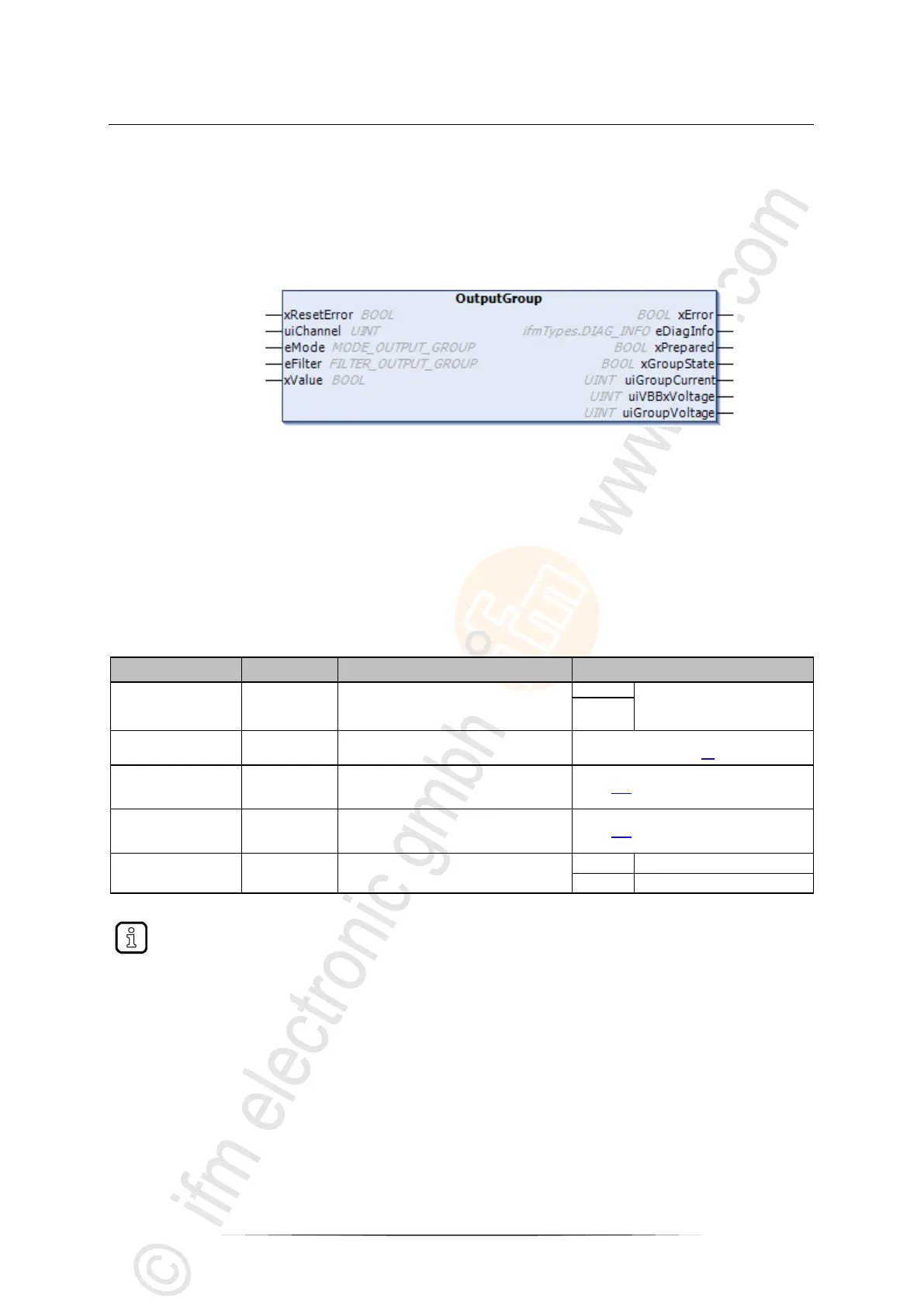 The FB controls the activation status of an output group and provides diagnostic information about the