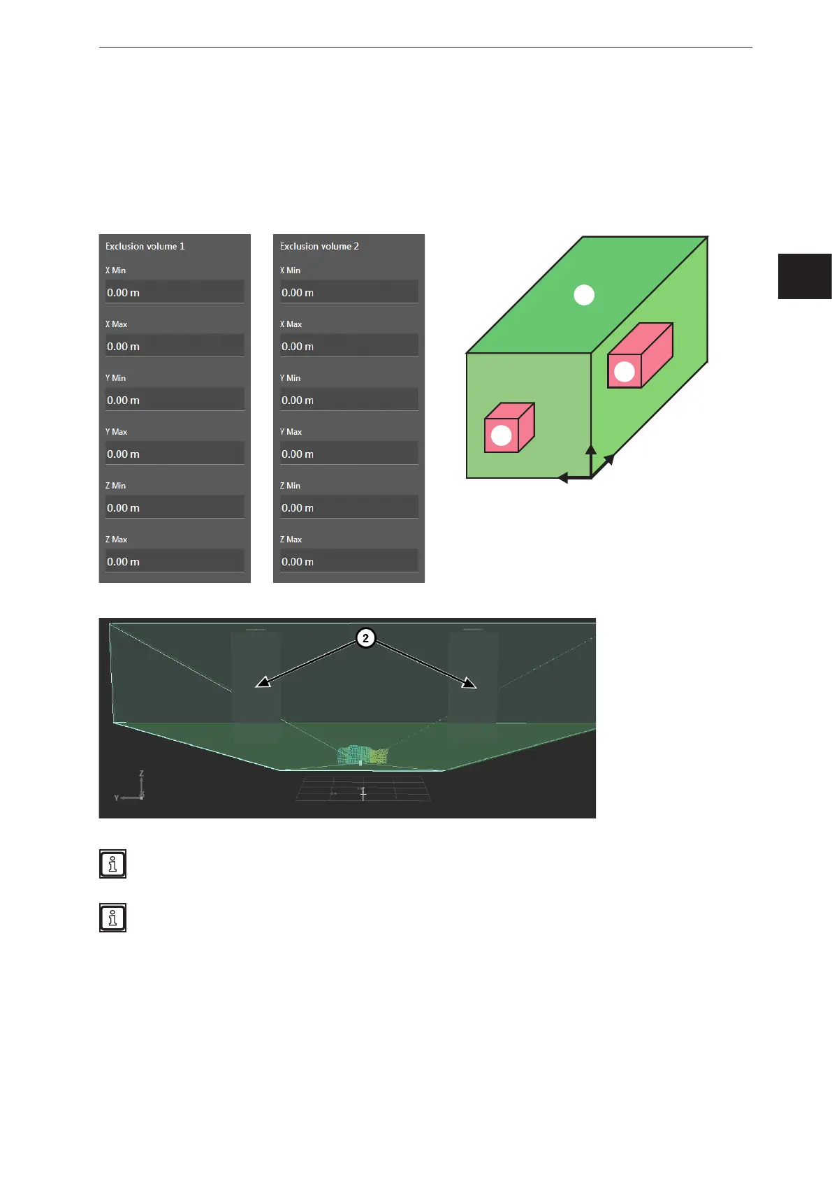 In addition to the measuring range, up to two exclusion areas ② can be set within the measuring