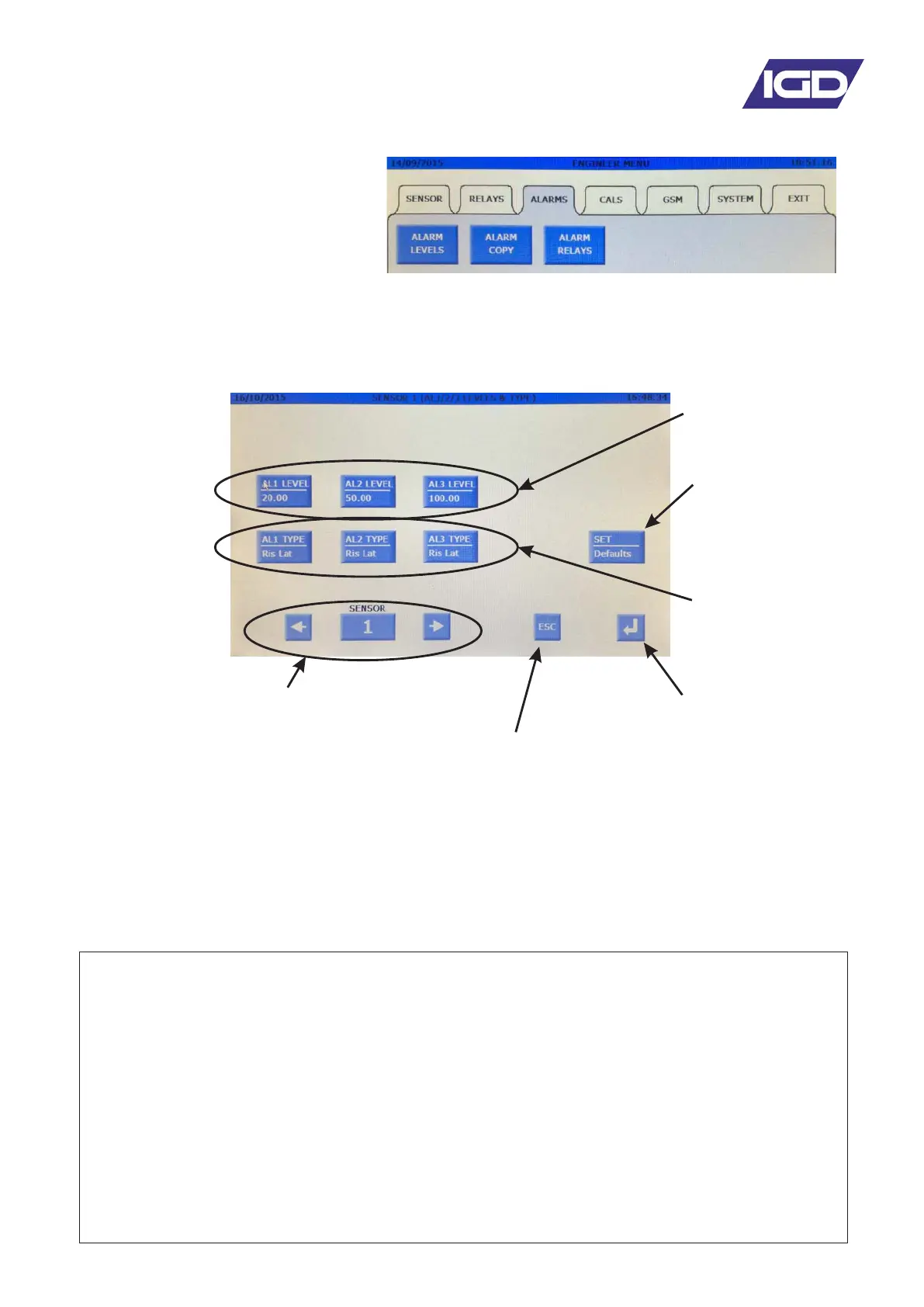 The Tocsin 750 allows 3 alarm levels to be set per sensor channel. This is set up in the alarm