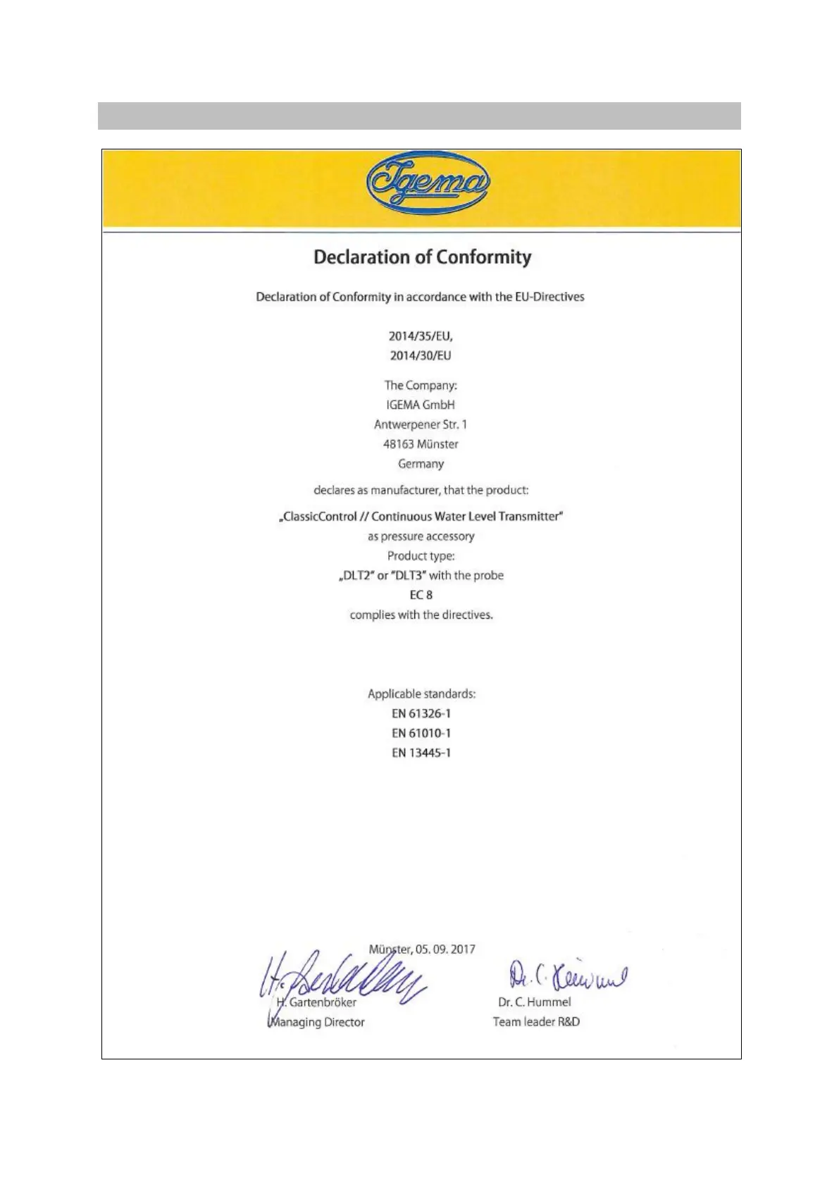 Igema DLT2 - Declaration of Conformity