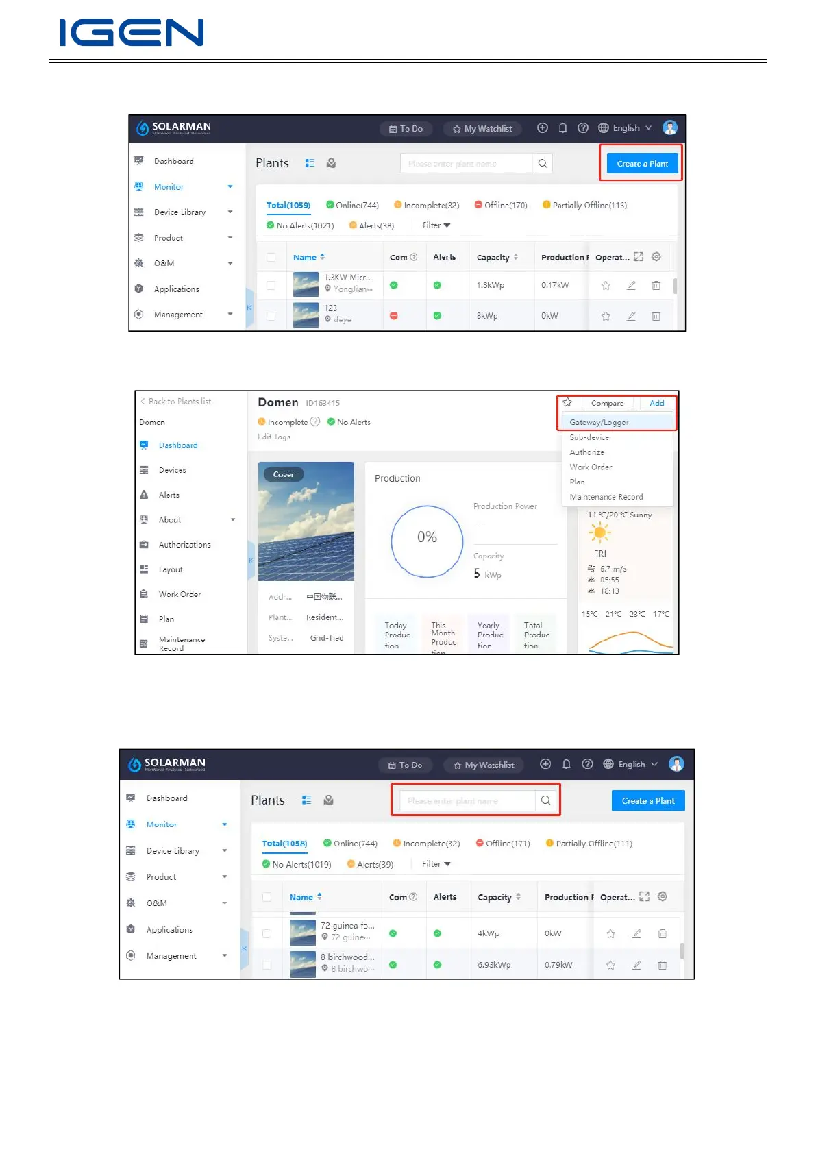Step 3: Go to a target plant, click “Add” in the upper-right corner, select “Gateway/Logger”, and enter device SN here.