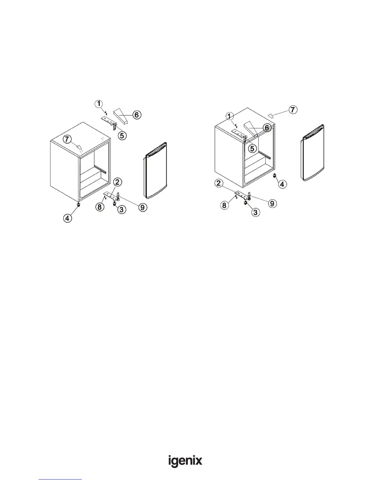 • Set the door to its place making sure the door sits on the lower hinge (2)
