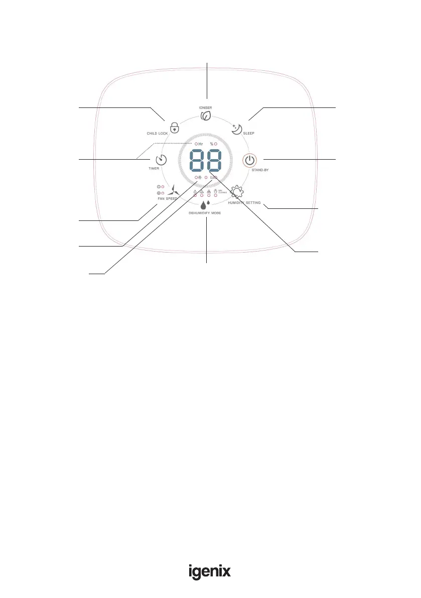 • The white illuminating LED will automatically display the Relative Humidity of the room; you can