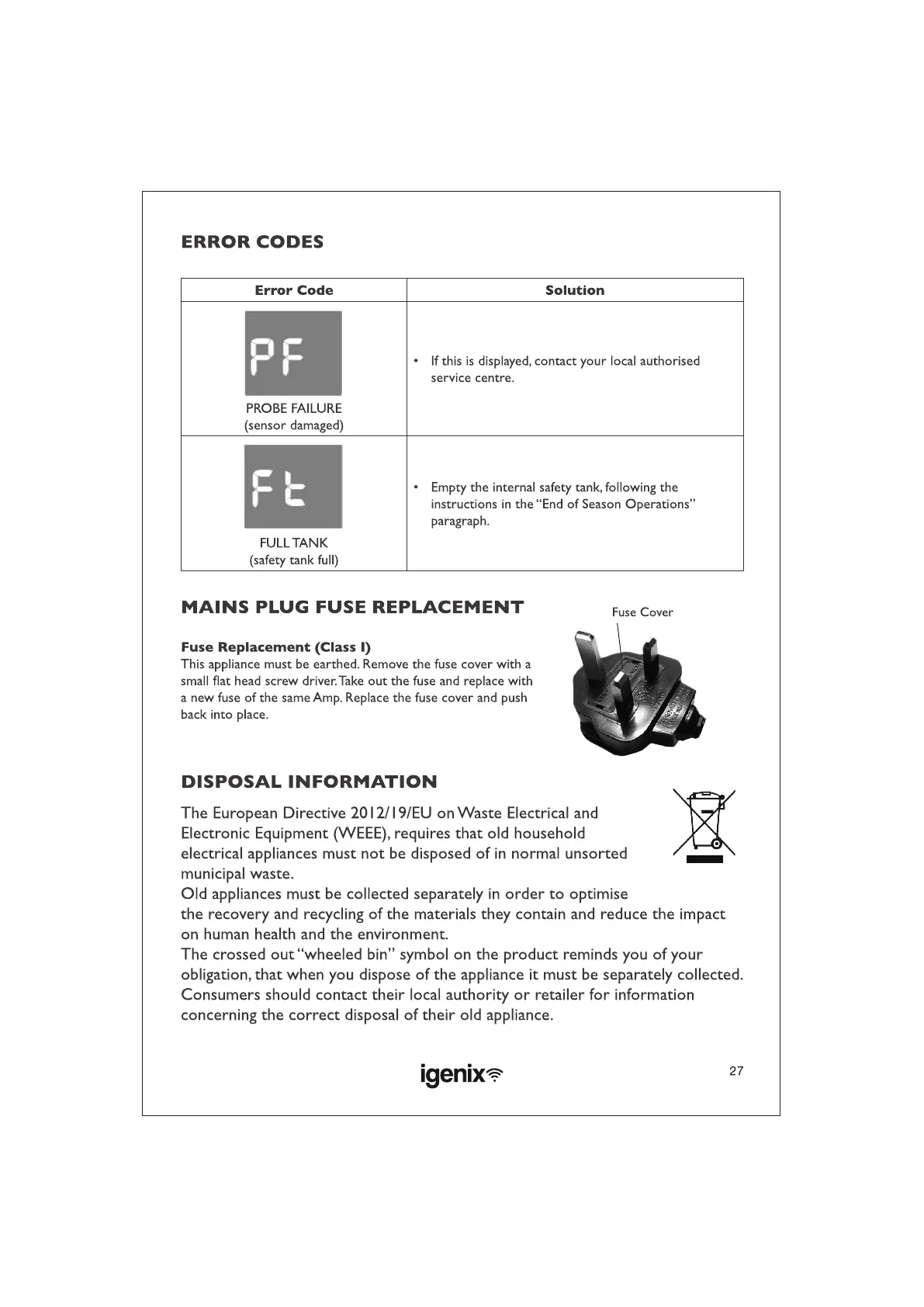 iGenix IG9909WIFI - Error Codes and Maintenance; Probe Failure Error (PF); Full Tank Error (FE); Mains Plug Fuse Replacement