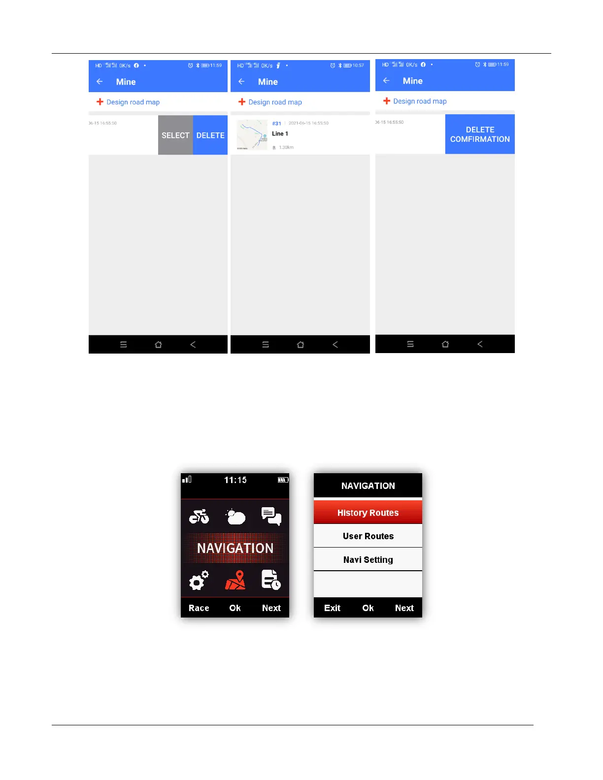 Enter NAVIGATION - History Routes to open the activity list, select the wanted routes, device will