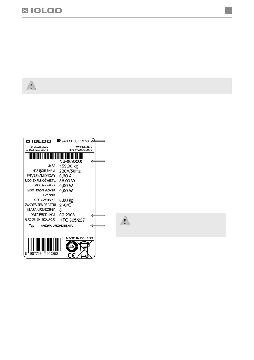 perly, please contact Technical Service of the Igloo company, stating the data from the data plate Fig. 10 (p.16)