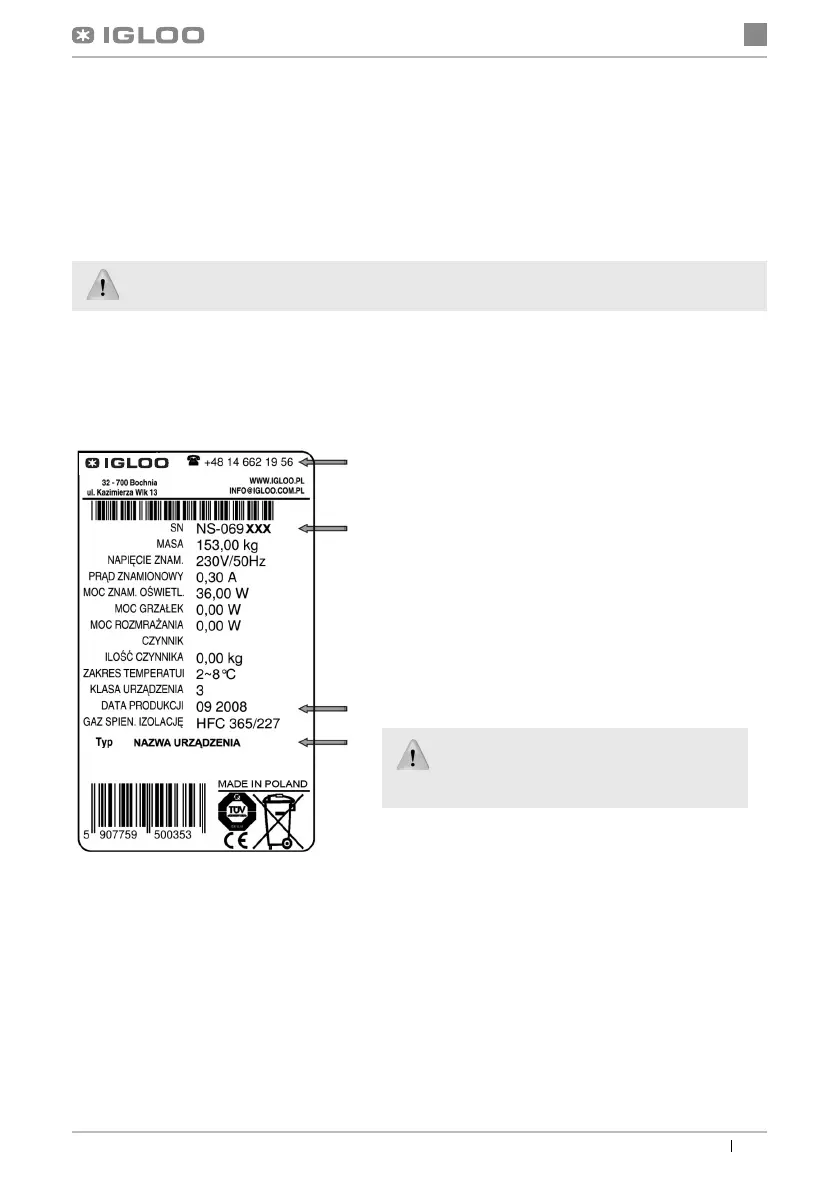 działa prawidłowo, należy skontaktować się z Serwisem Technicznym fi rmy Igloo, podając dane z tabliczki zna-