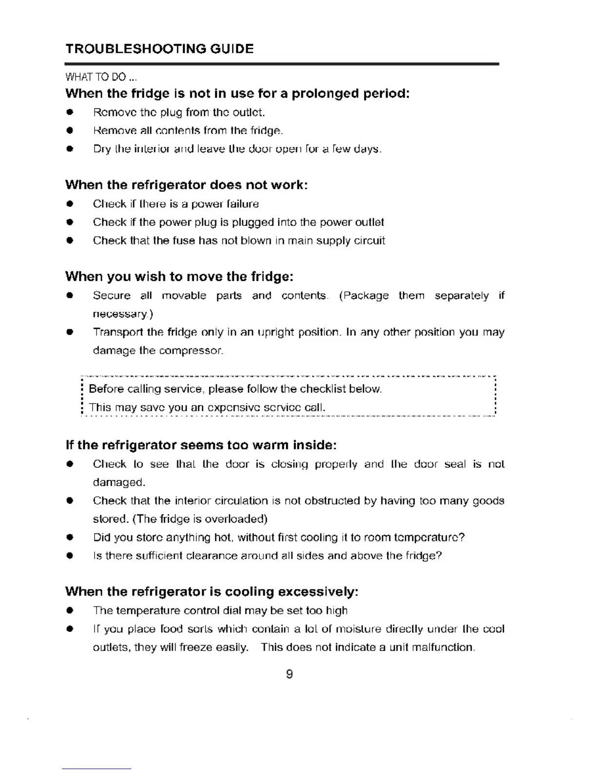 Igloo FR322 - Troubleshooting Guide; When the fridge is not in use for a prolonged period; When the refrigerator does not work; When you wish to move the fridge