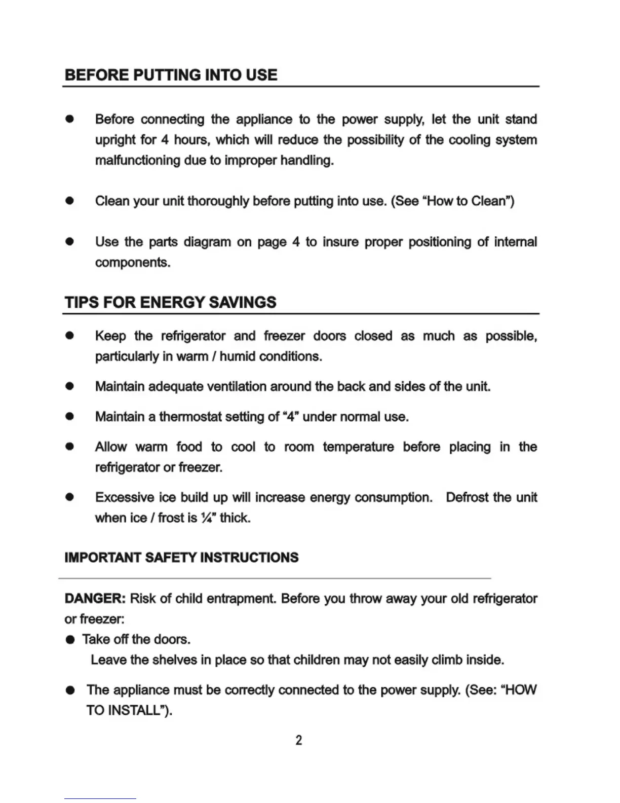 Igloo FR322 - Before Putting Into Use; Tips For Energy Savings; Important Safety Instructions