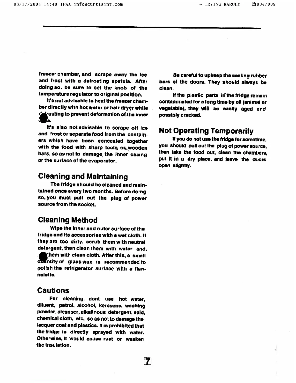Igloo FR832 - Cleaning and Maintenance; Cautions for Cleaning; Temporary Storage