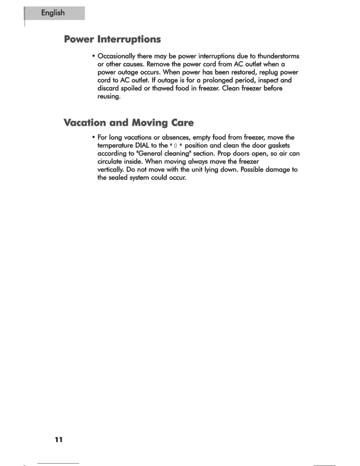Igloo FRF434 - Power Interruptions; Vacation and Moving Care