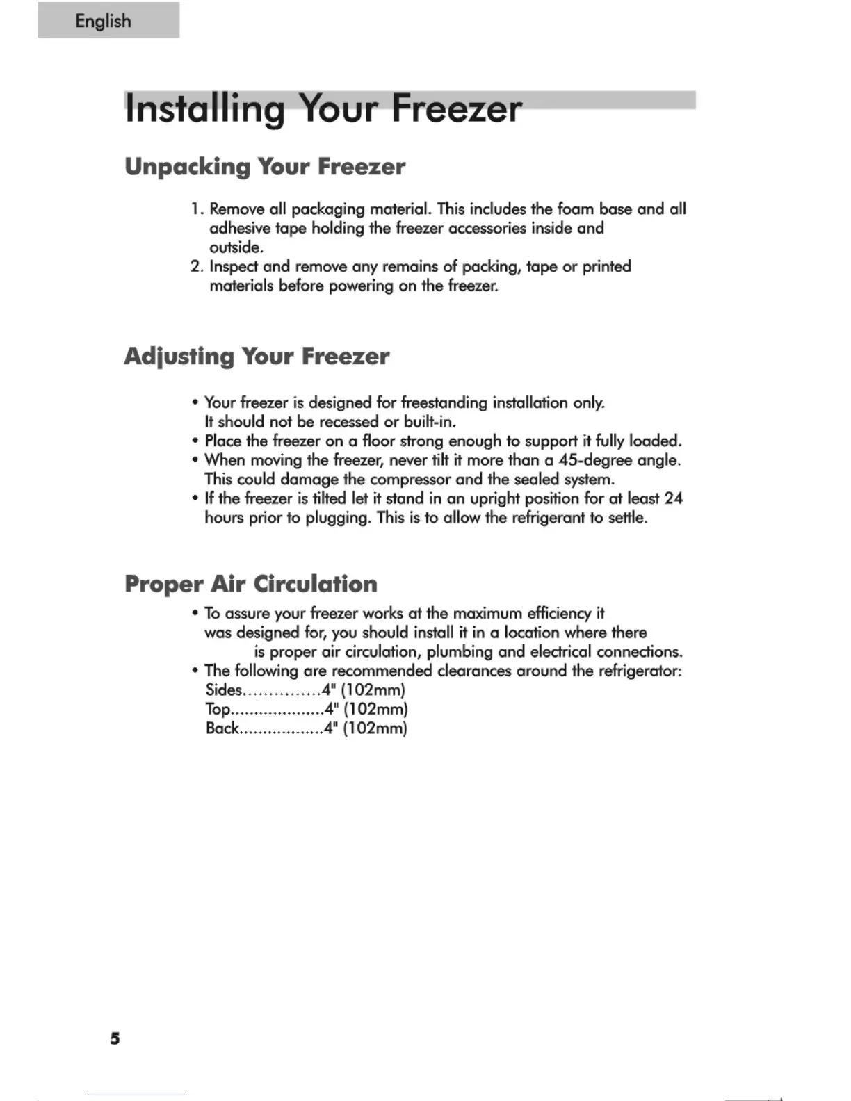 Igloo FRF434 - Installing Your Freezer; Unpacking Your Freezer; Adjusting Your Freezer; Proper Air Circulation