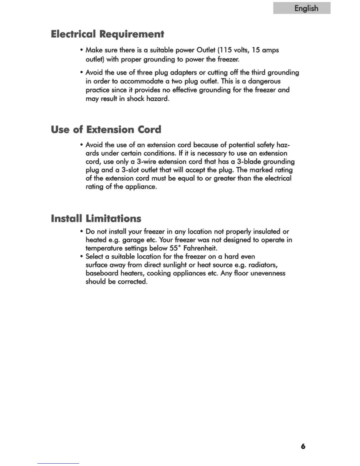 Igloo FRF434 - Installation and Operational Requirements; Electrical Requirement; Use of Extension Cord; Install Limitations