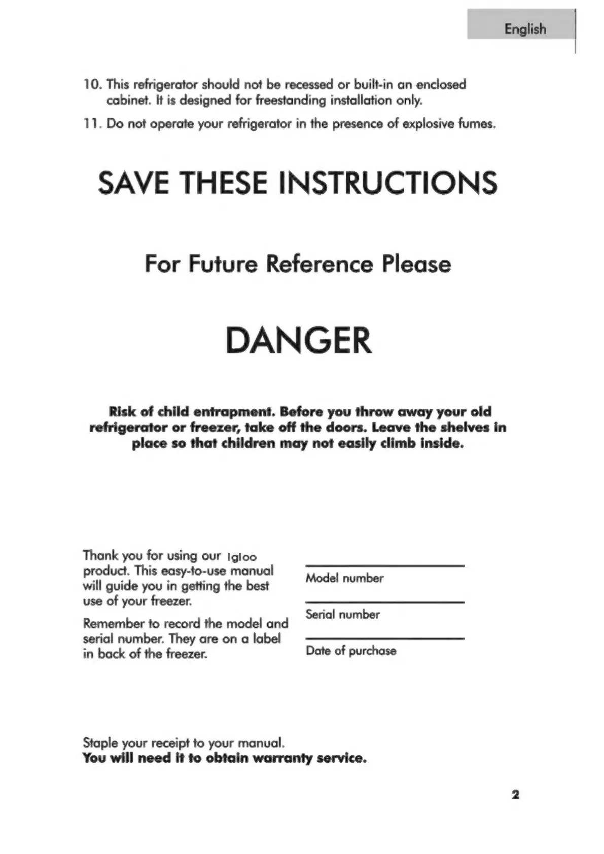 Igloo FRF452 - DANGER: Child Entrapment Warning; Save These Instructions