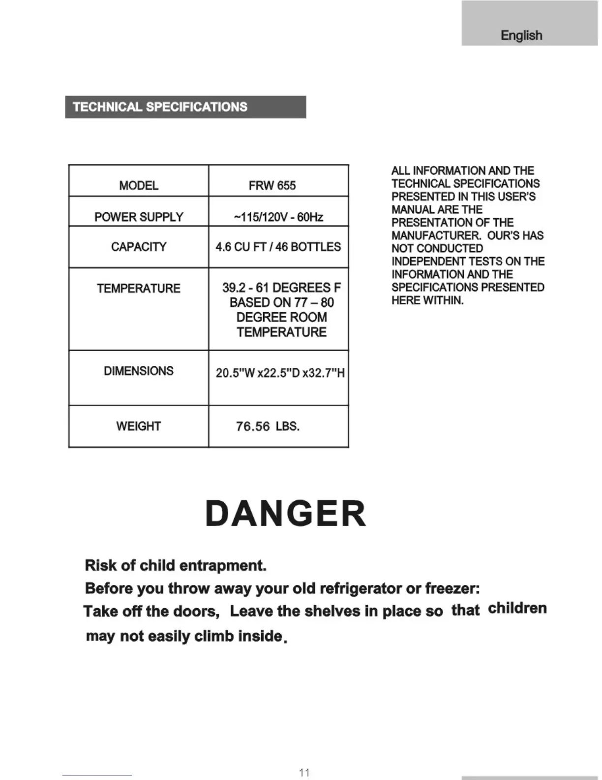 Igloo FRW655 - Technical Specifications