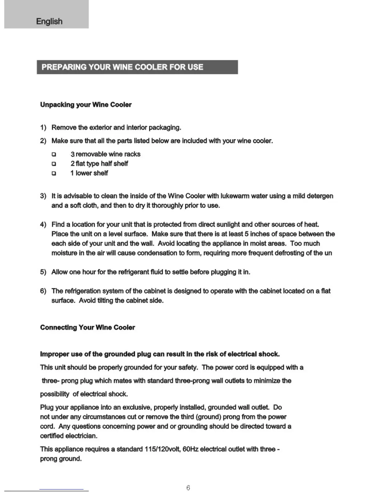 Igloo FRW655 - Preparing Your Wine Cooler for Use; Unpacking Your Wine Cooler; Connecting Your Wine Cooler