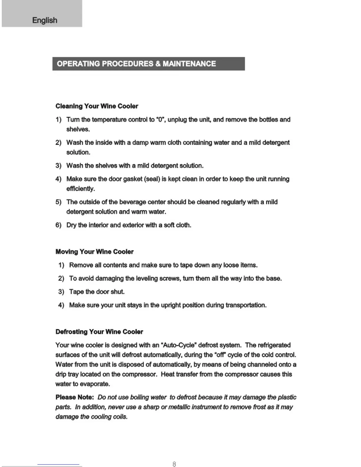 Igloo FRW655 - Operating Procedures & Maintenance; Cleaning Your Wine Cooler; Moving Your Wine Cooler; Defrosting Your Wine Cooler